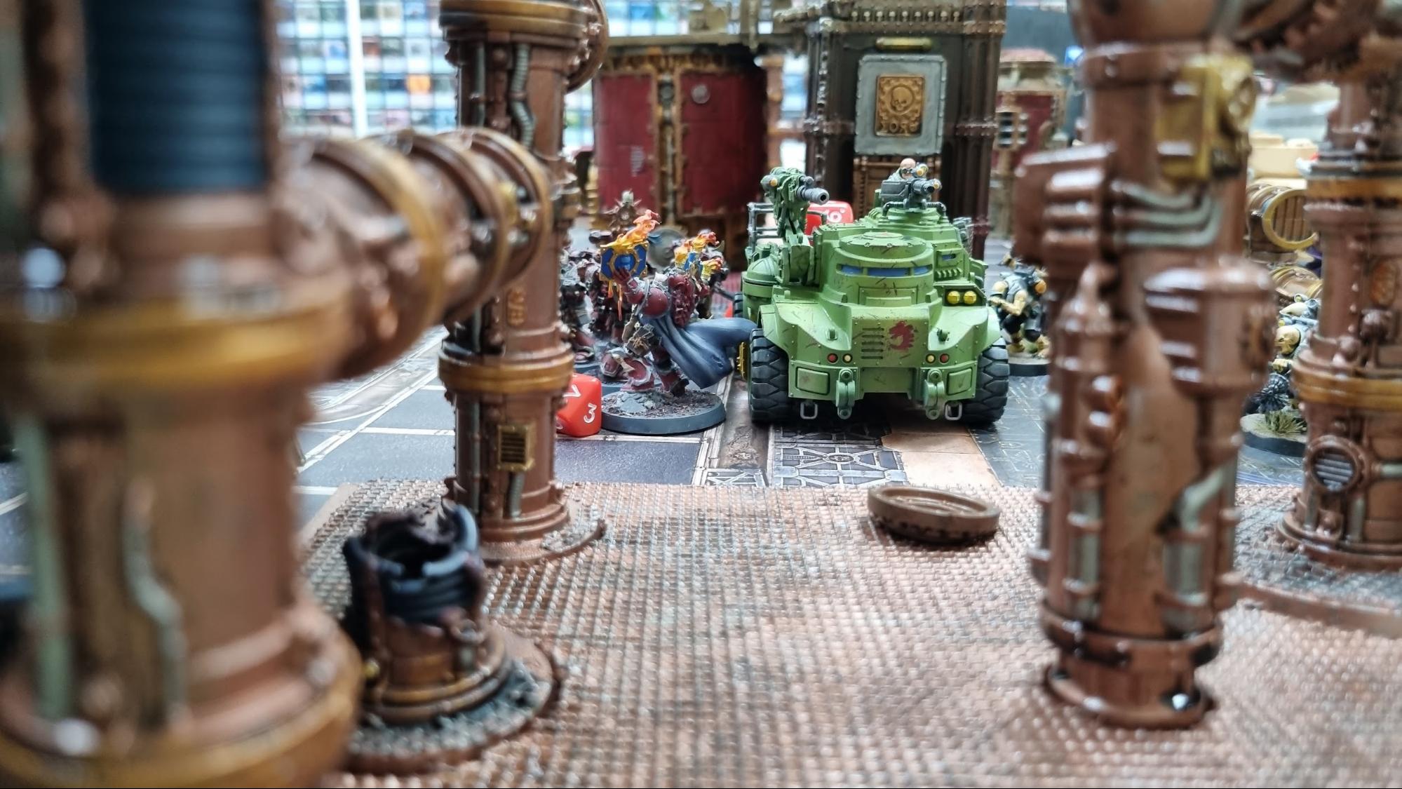 The focus of the war has shifted to the area surrounding the Governor’s Palace, with the Imperials largely abandoning the prison to the forces of Chaos and the Cults of Genestealers. The flow of mutants has been slowed by the Imperial Forces, though the Agrippa Rippers artillery runs have been opening new entrances for the hordes.A recent arrival to the planet, Grand Master Adontor of the Grey Knights has been hunting a greater daemon across the planet. The Daemons influence found its way into the Black Templars crusading force, appearing to them as a being of golden light. Tricking them into attacking the Grey Knights, they were swiftly defeated, and the Daemon banished.