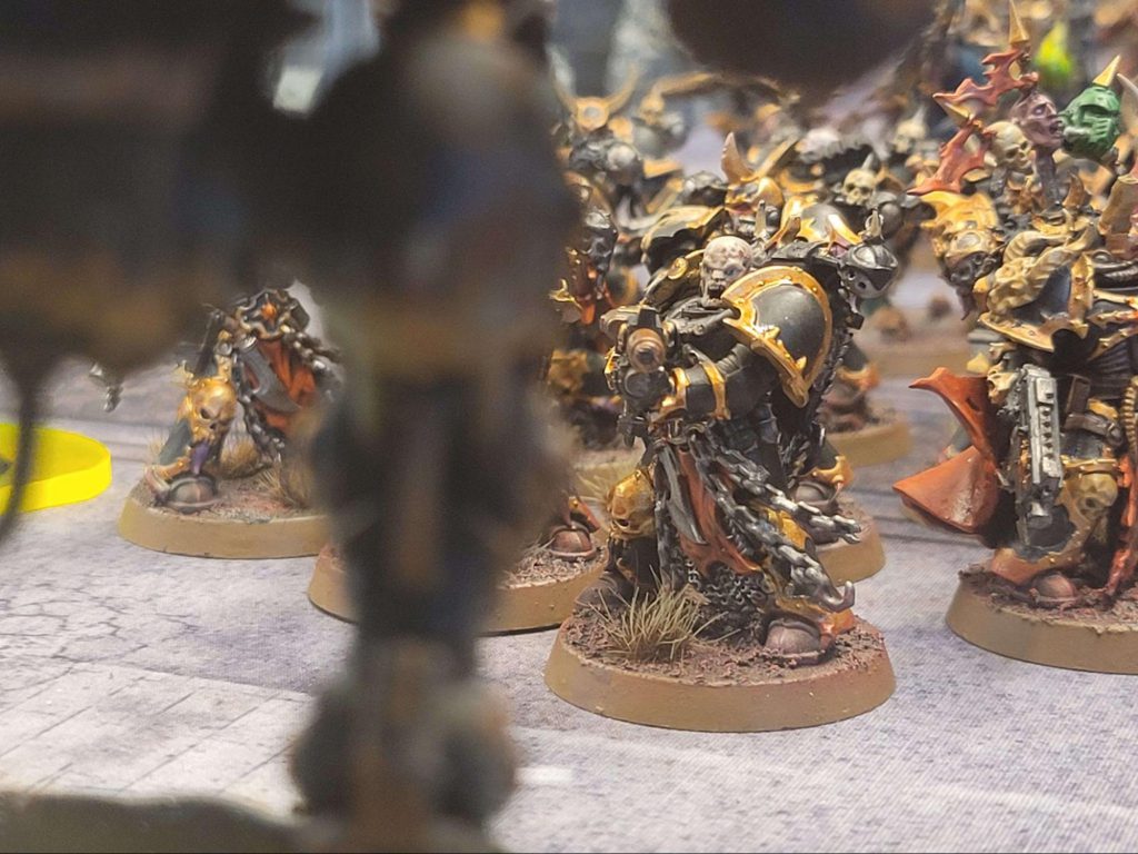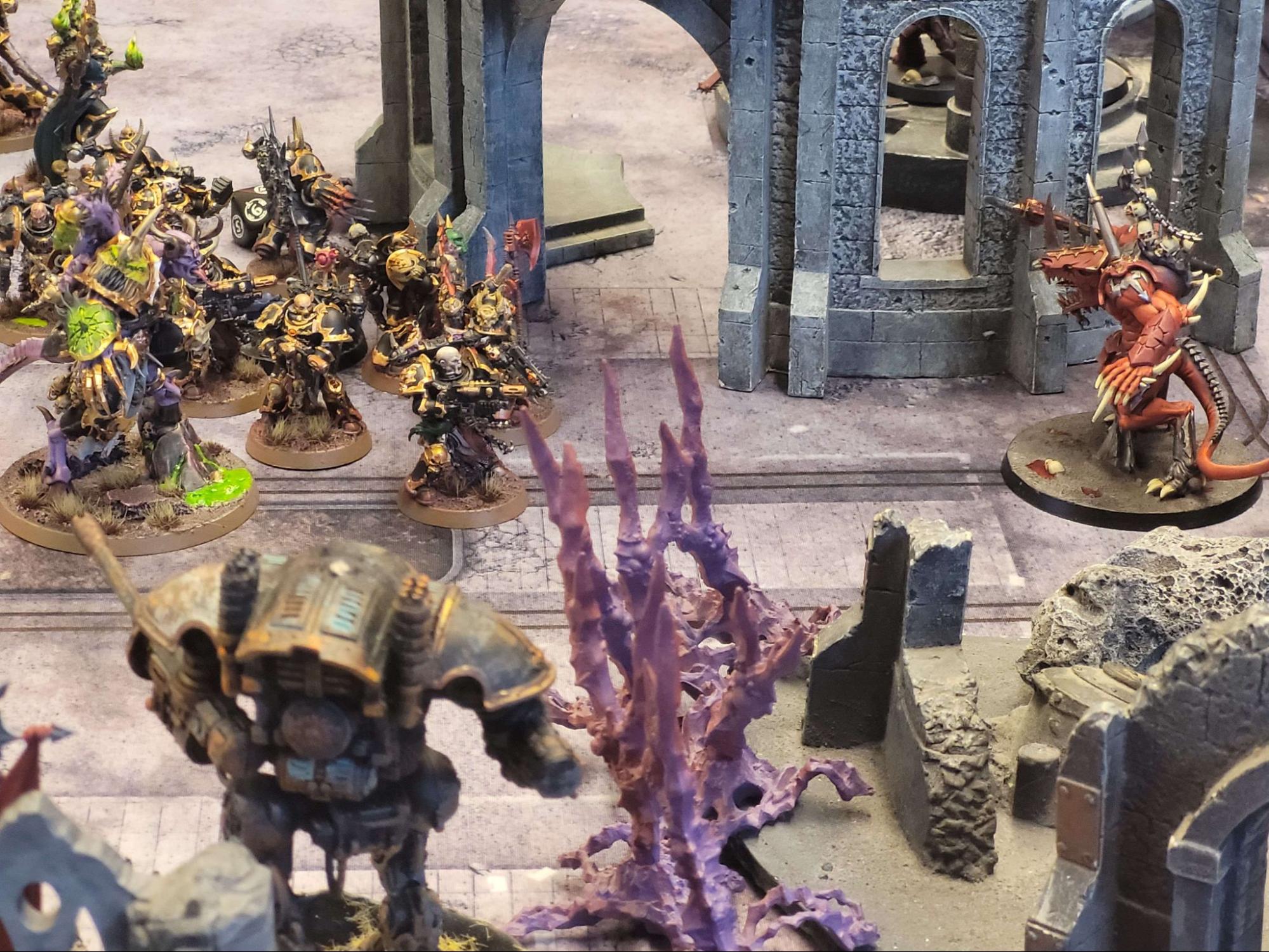 Fighting rages on the Moon as factions scour it for the secrets it may hold. The Aeldari of Craftworld Iásar-Athreith search for a hidden artifact known only to them. The forces of Chaos and the Imperium vie for control over the infrastructure left there. As it stands the putrid forces of Chaos are successfully keeping the Imperium away from the archeotech there with the Chaos Knights of Rusted Talon leading the charge.