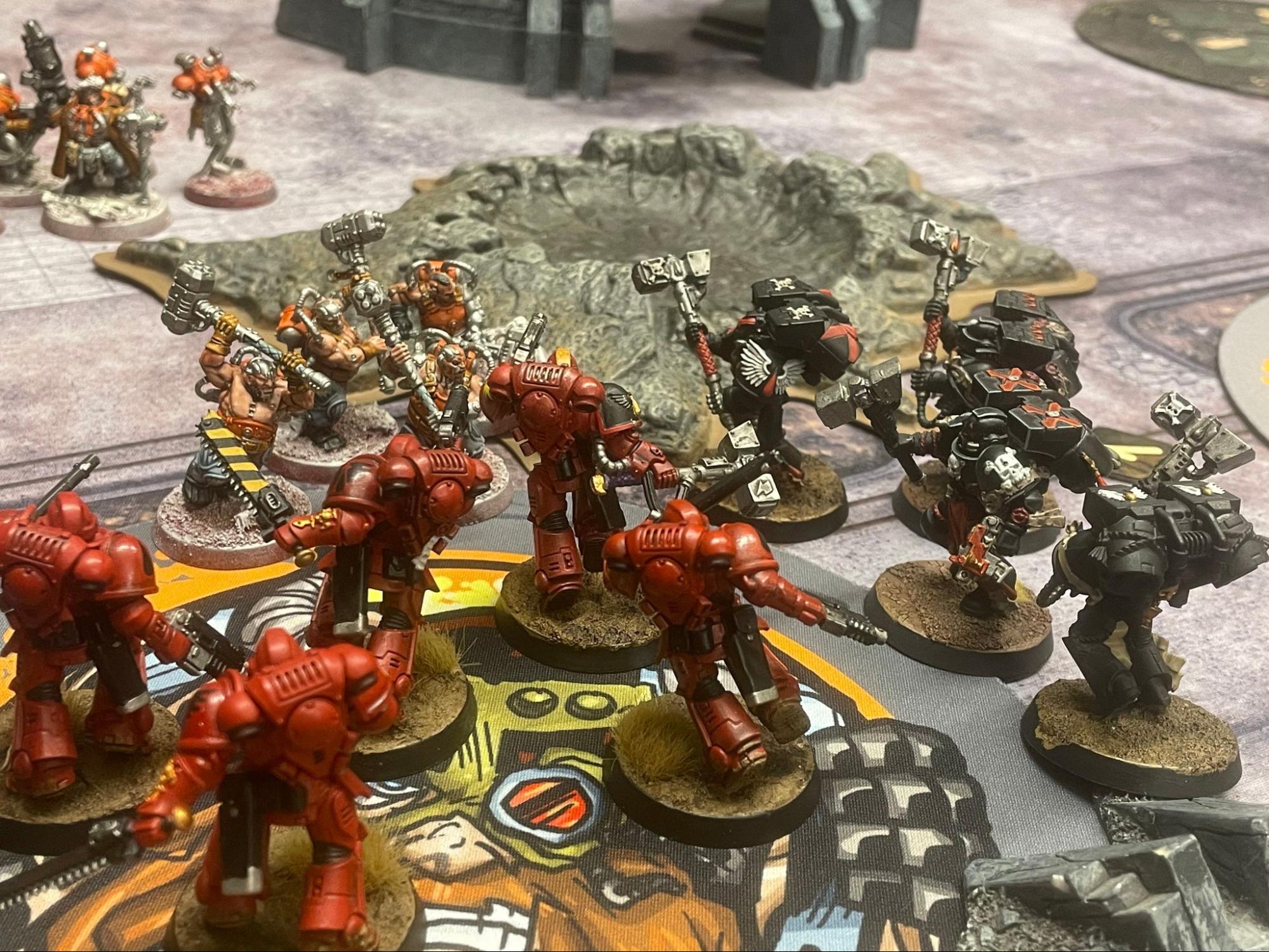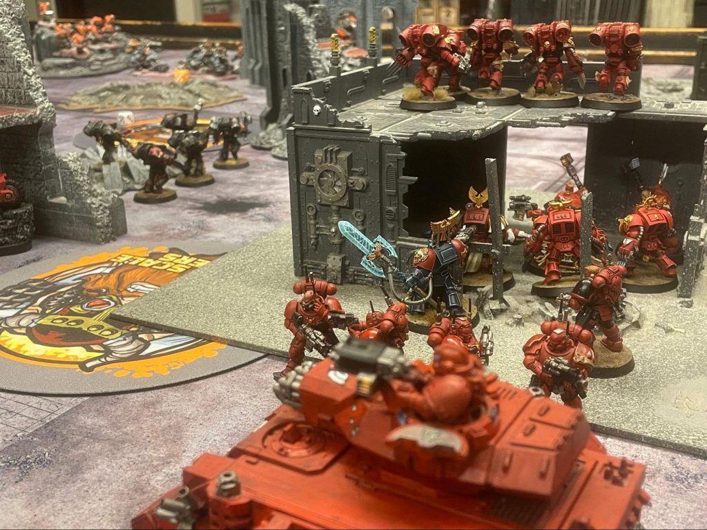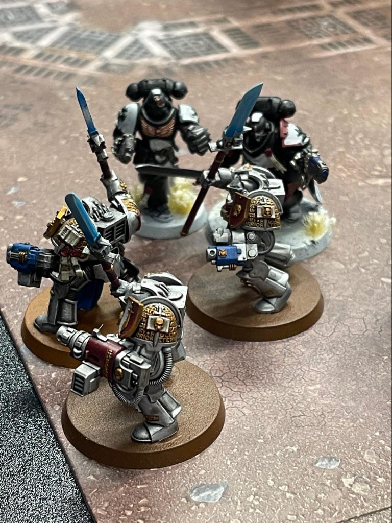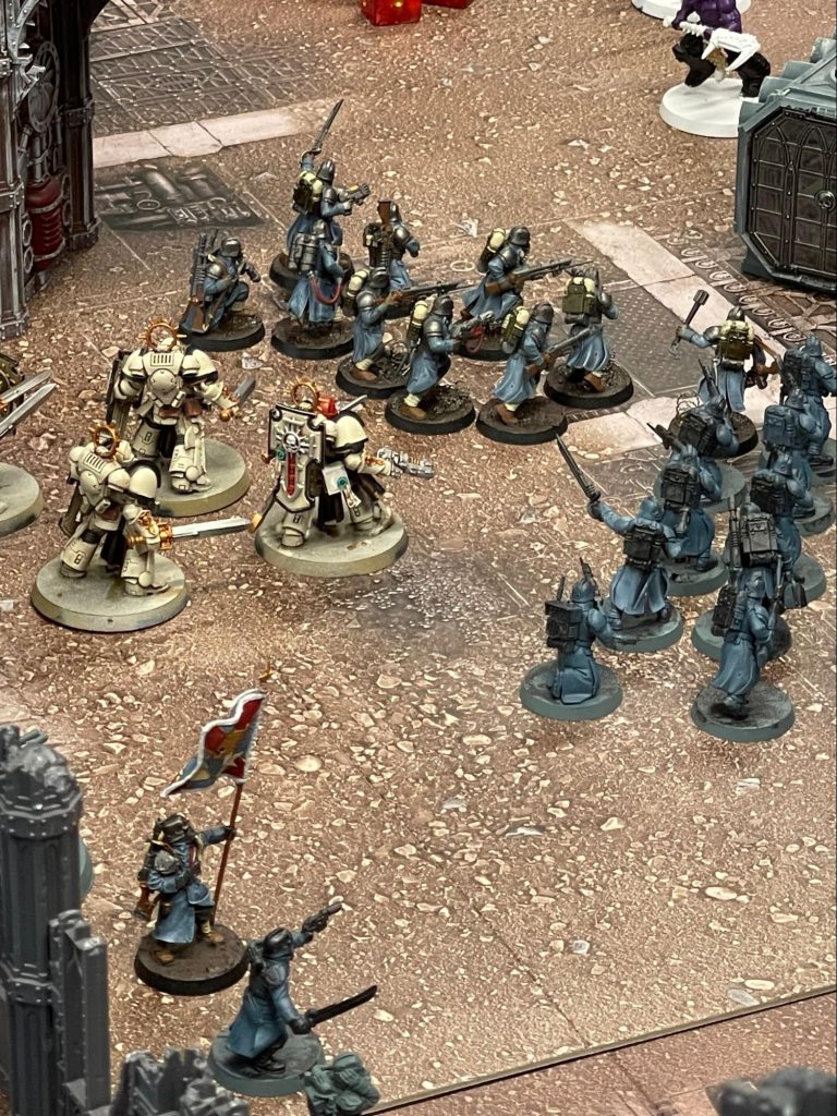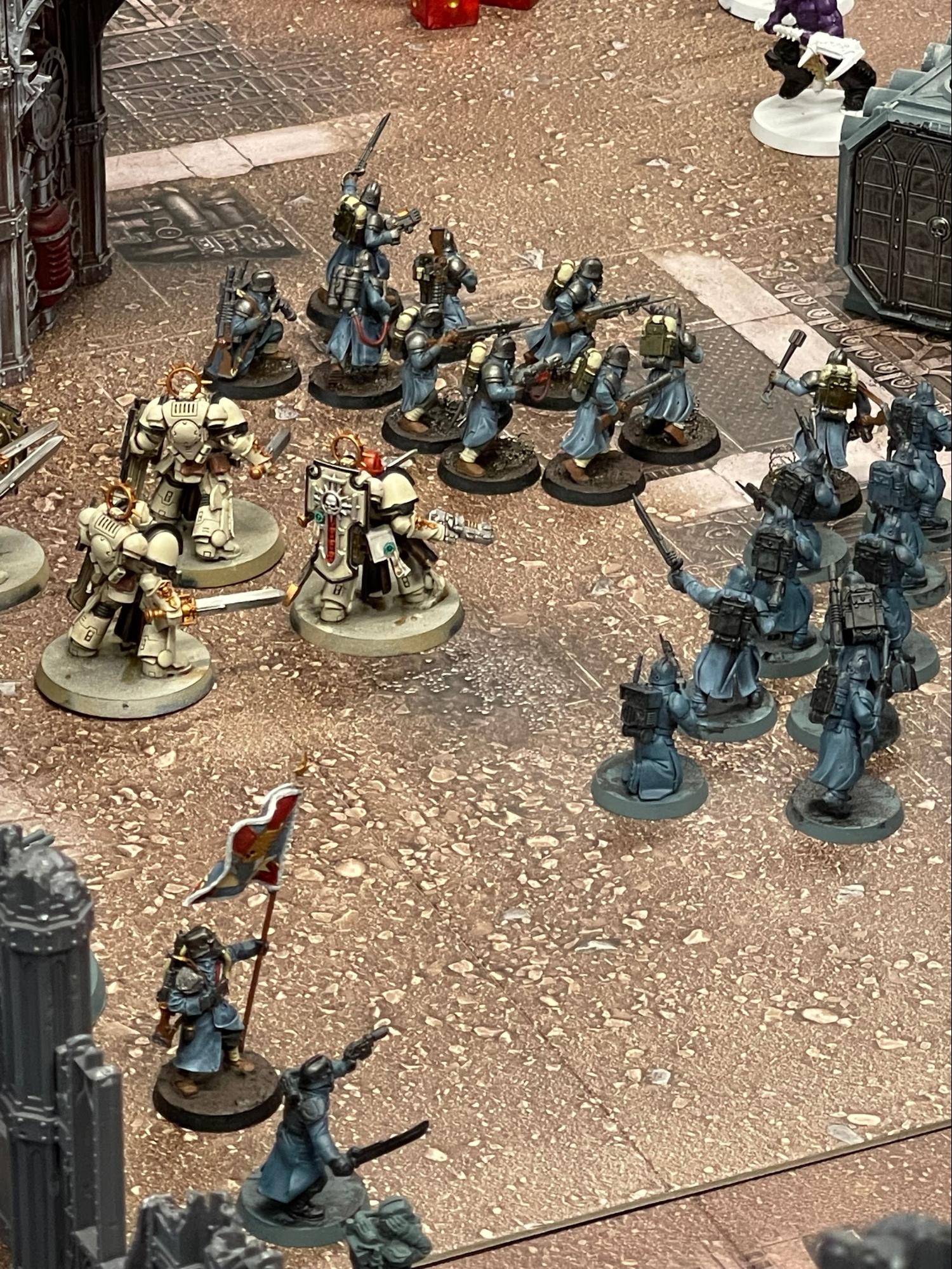 Grey Knight Terminators battle the Black Templars on Agrippas desert.With the advance on the Governor’s Palace gaining traction among the World Eaters and Thousand Sons, the Reclamation Fleet and PDF have reorganized their effort to stand against the encroaching chaos warbands.