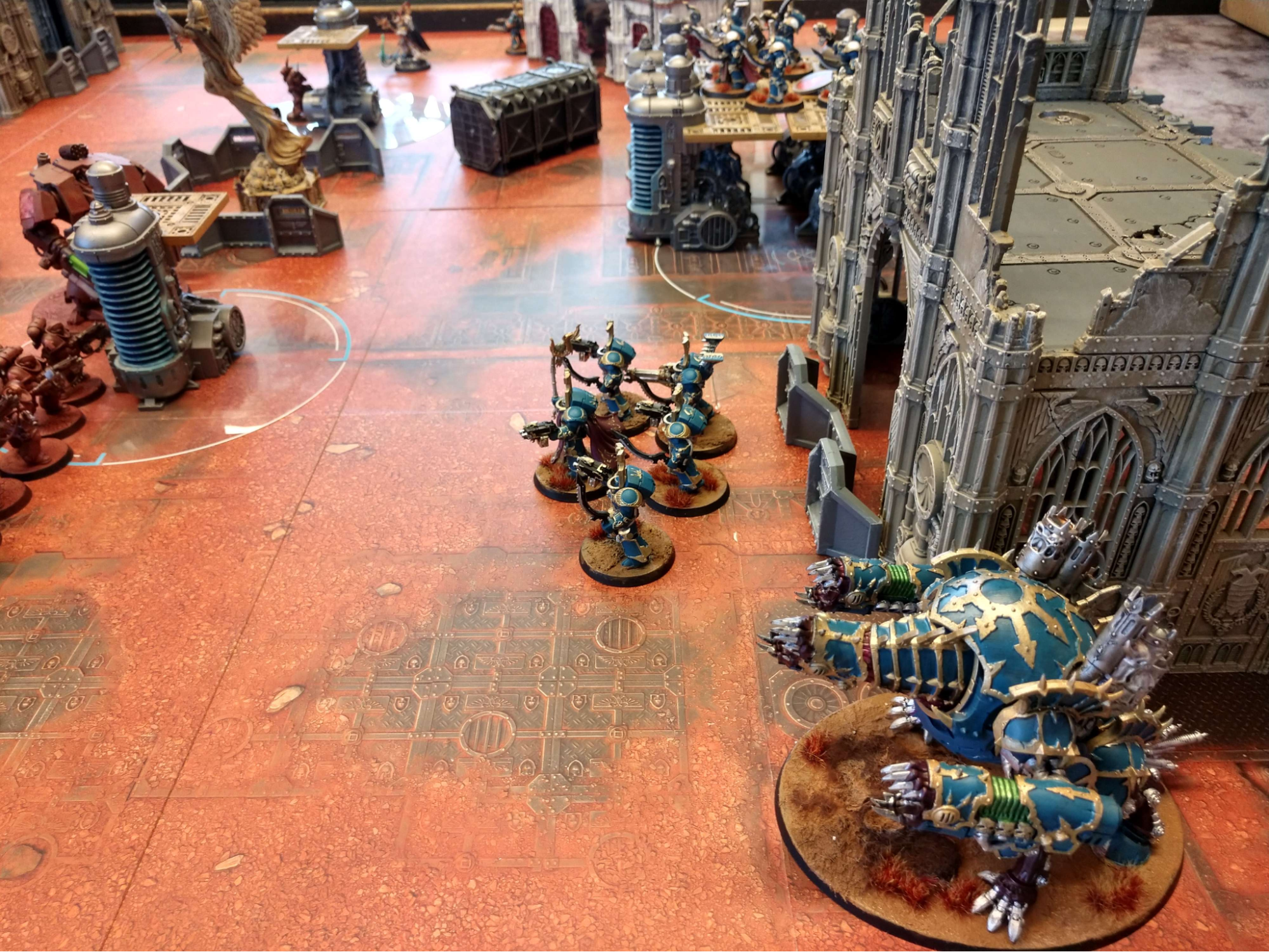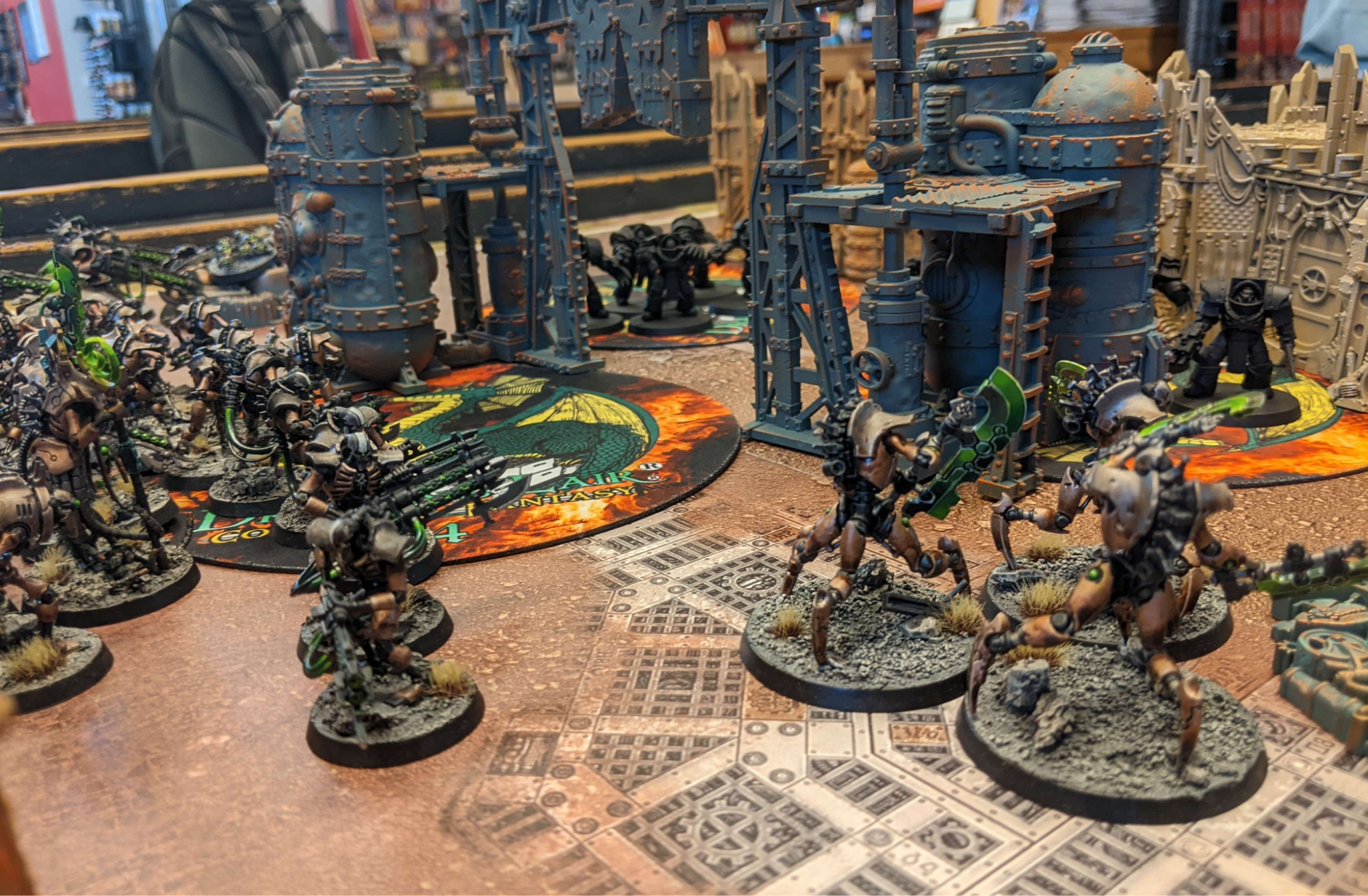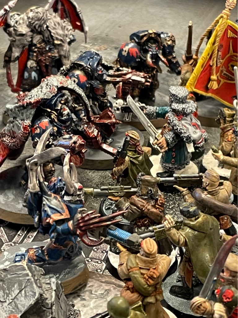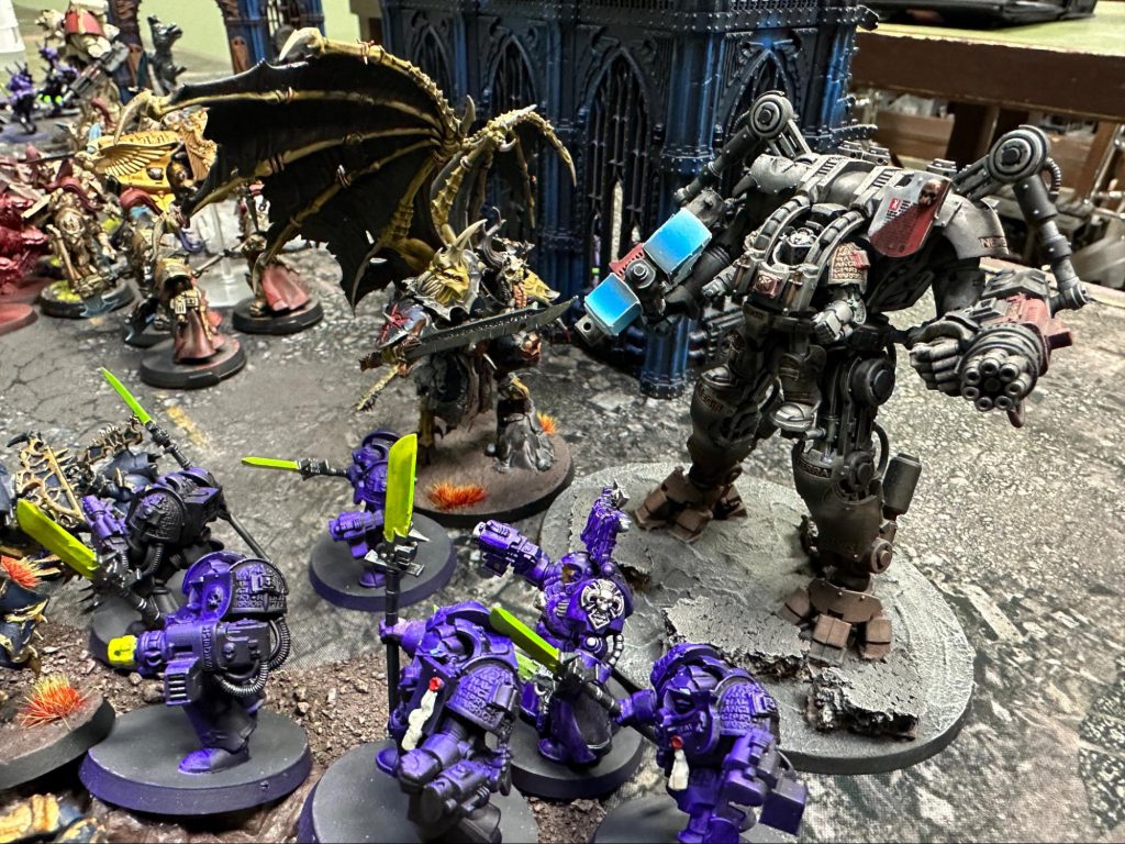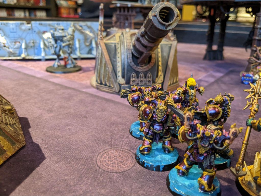 The Kin of Kahl Durin Anvilglad face down the chaotic terrors of the Dreadforge Assembly amidst the distillation tanks of the Algol VII complex. Photo: Luke B.The fiercest fighting thus far has been seen at Rally Point Dauntless, the Space Marine forward operating base south of Miltner’s Docks. The Sun’chur Dynasty has appeared in force to secure their forces and materiel located nearby.