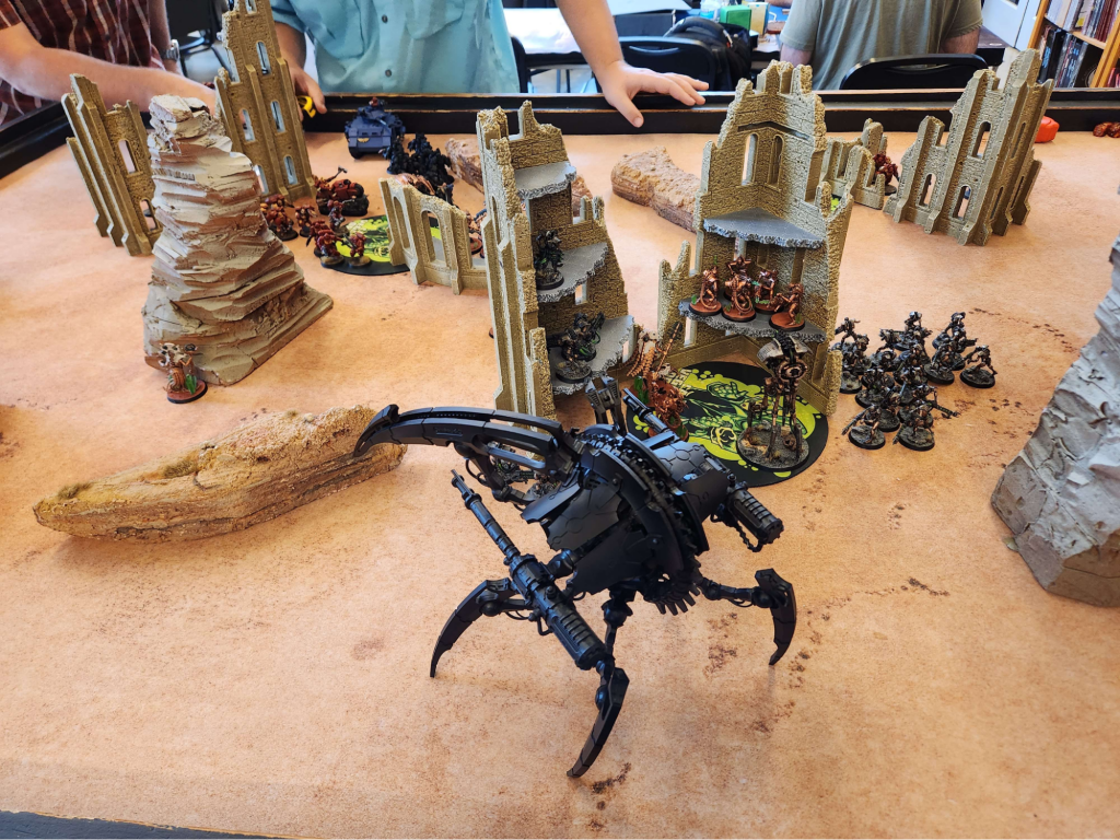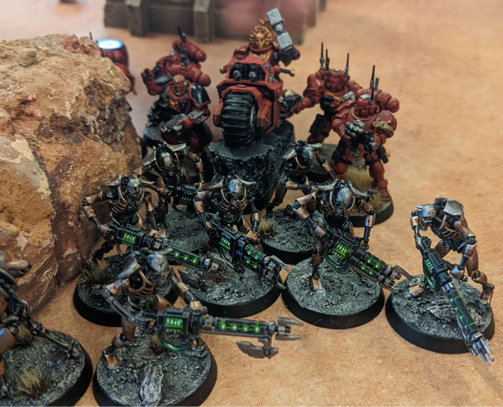 The forces of Lord Topherus clash with the Dark Angels of Strike Force Fervent Rebuke in an abandoned mining facility. Photo: Chris W.The Phobos elements of Strike Force Gladius determined that the Necron activity was focused around a presumed tomb complex in a sandblasted ravine. The Blood Angels and Ultramarines launched a daring assault to try to disrupt the Sun’chur Crypteks’ plans, but found themselves just too late to prevent the Necrons from unearthing and awakening a titanic Seraptek Heavy Construct.
