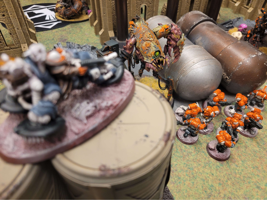 Task Force Hacienda of the Crimson Fists fight valiantly against the Tyranid AmbushI have Biologis Echo Ripley here again to comment on continuing rumors of monsters in Sniper’s Alley: