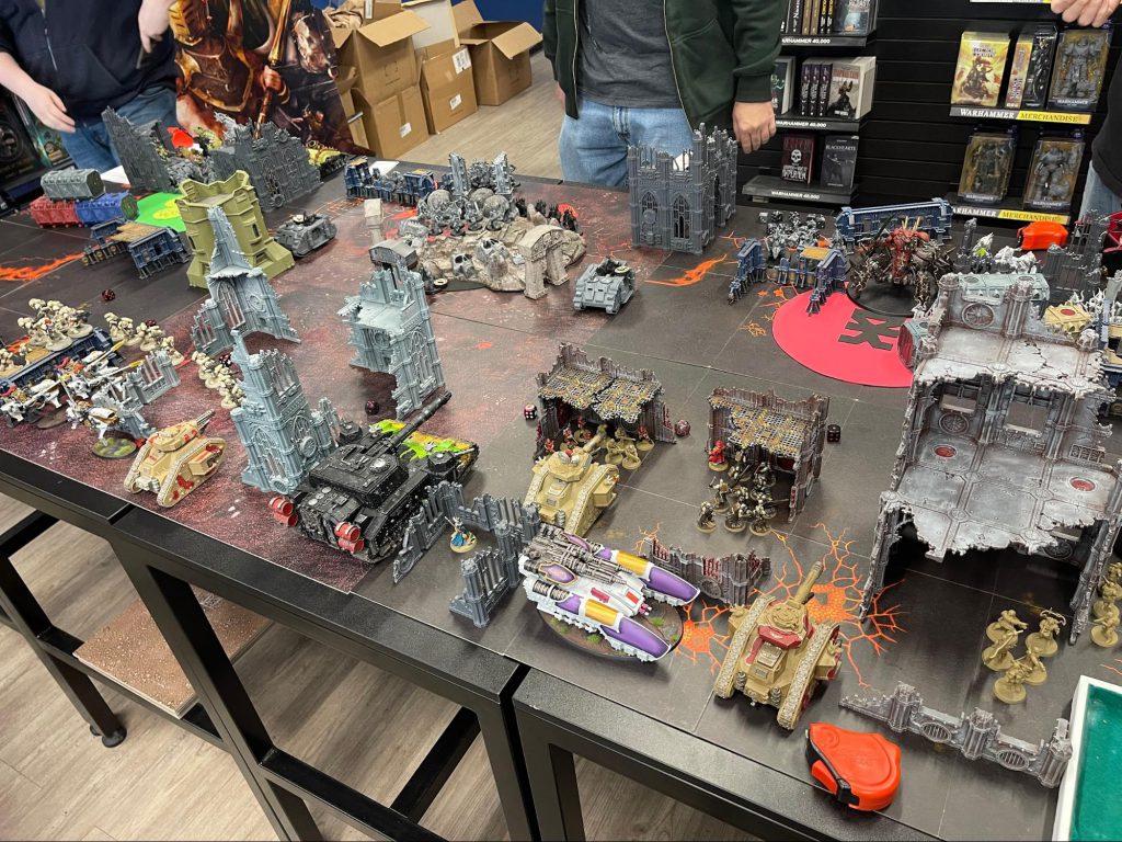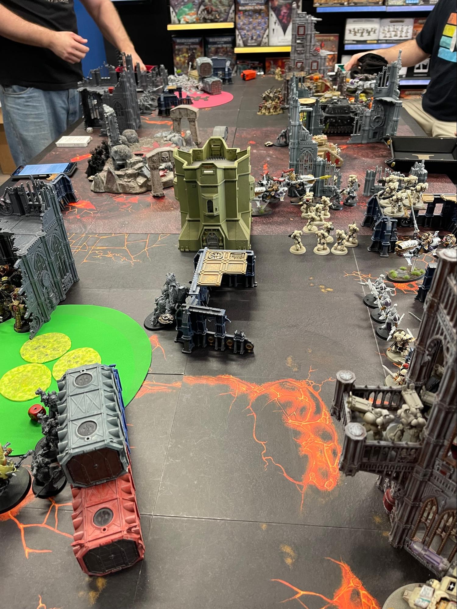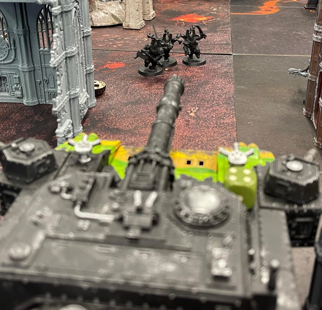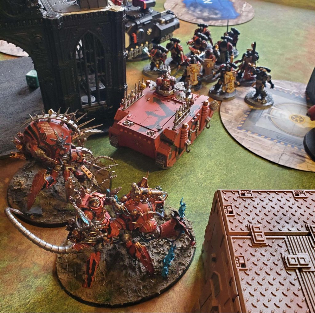 On the west flank the Tome Keepers squared off against the Septet of Sewage, with their droning poems and the chanting of the ritual being blasted over their vox speakers. On the east flank, the Crimson Defenders brought to bear their heaviest tanks against the horde of Daemons of Khorne, with tank commander Cody at the helm of his Shadowsword. In the center, the Custodes strike force “Sol Operis” took point against all three, using their speed to try and pin the armies of Chaos.