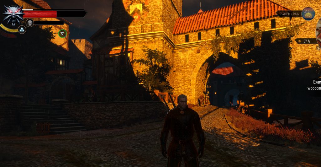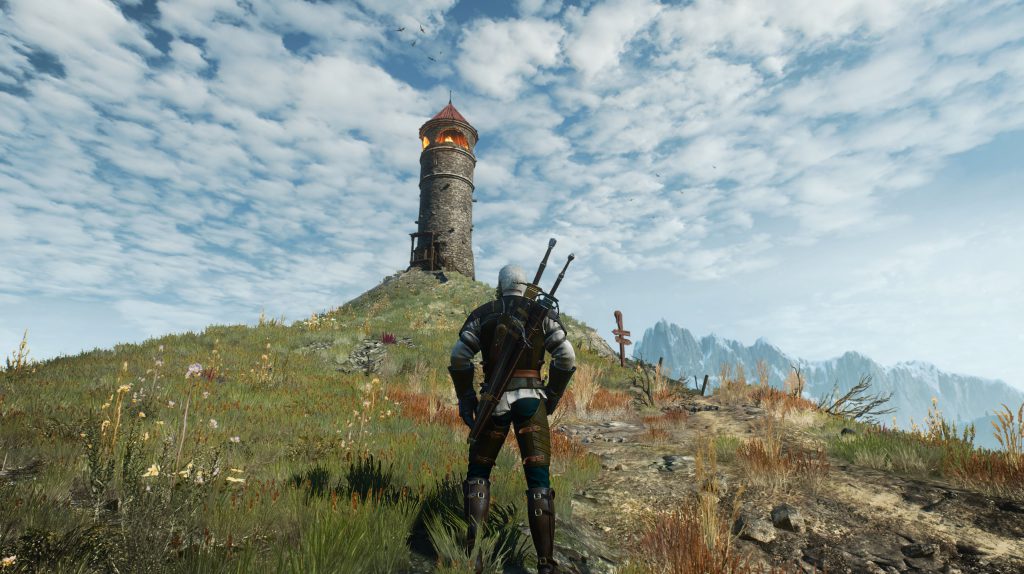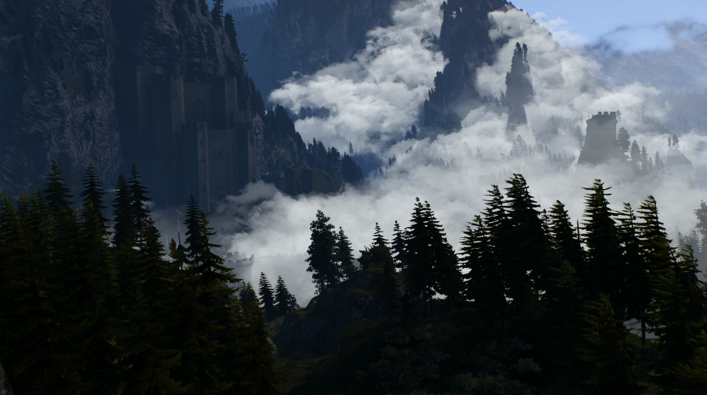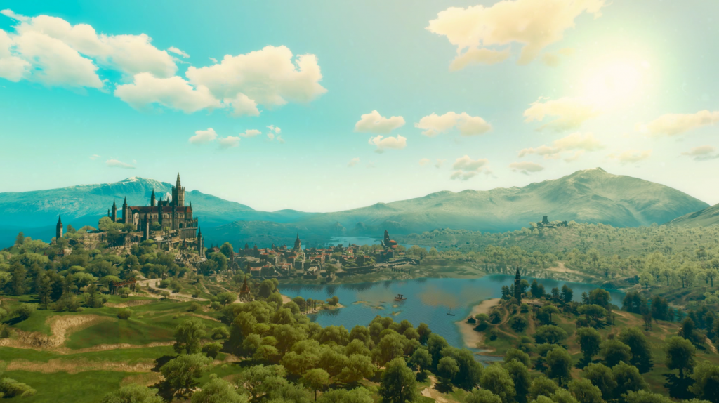When the game is just casually beautiful.The Witcher 3 synthesizes all of these things. It takes System Shock 2’s lead by pushing the technology it’s using precisely to its limits and never beyond; it innovates within its hardware space to create a truly unique look that isn’t going to get improved upon by adding more pixels. Due to differences in era, this is done mostly through its shaders and lighting rather than its models. This is where Skyrim comes in: the skybox and the weather effects are integral to the game’s look and feel. The Witcher 3 is cynical in a way; it looks at the weather and the skies that exist in the real world, and it decides to only represent a few of them. There are no boring overcast days in the world of The Witcher 3. On the very, very few days that the sun is blotted out by clouds, the clouds fight with the striking blue for mastery of the sky. The usual weather at the midnight and noon marks are, respectively, deep night with clear skies letting you see all of the stars above and pastoral blues with rolling fluffy clouds. Sunrise and sunset last five hours or so each, and for good reason: the art team knew that the most striking vistas you can portray in an environmental day/night cycle come at the moments of highest contrast, when shadows are at their most pronounced and purple, orange, and deep red are the colors on your palette. The world of The Witcher 3 is almost constantly in these states because they’re the way to highlight its beauty.