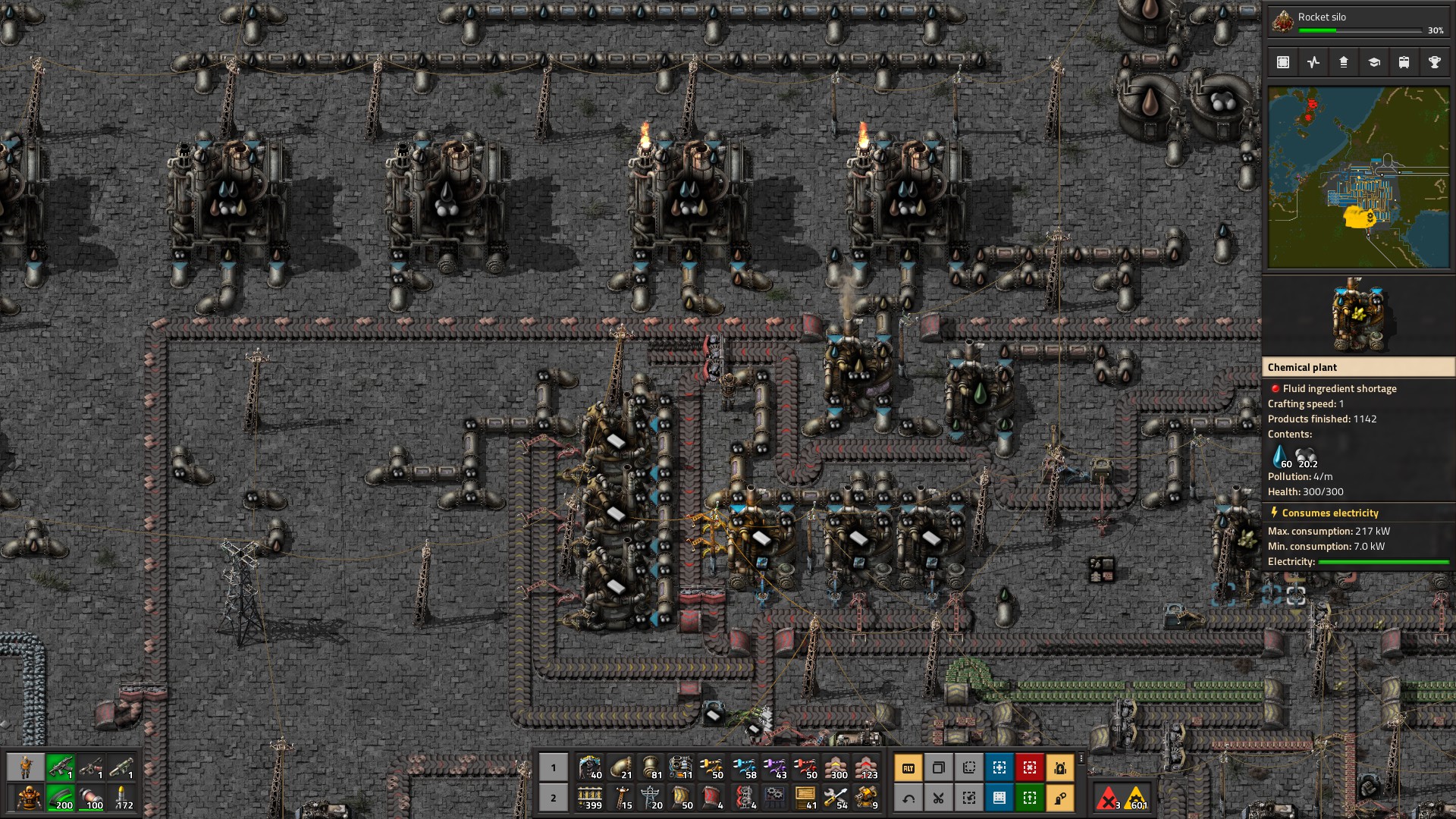 The bugs have two advantages: finite resources and only needing to succeed briefly. The most dire situation in Factorio is when one of your mining bases runs out of raw materials without you noticing. When an extractor runs dry then it sends a cascade of failure through your entire factory. Just-in-time supply lines hiccup. Overall production drops. Arms manufacturing slows. A few missed bullet production cycles for a base under pressure by the bugs might let some get close enough to punch a wall a single time before it dies. And once that state is reached then with a drip-drip-drip inevitability it's only a matter of time before the bugs crack that wall, smash your turrets, and run rampant inside the base. And once they're in there's nothing to stop them until they hit your defenses on the other side of the complex. Your whole carefully built killing machine is left in ruins and the bugs move in to colonize the remains. You can rebuild, of course, but to rebuild you need those same scarce resources whose depletion led to the disaster in the first place, and to get them you need to push further out into the infested world.