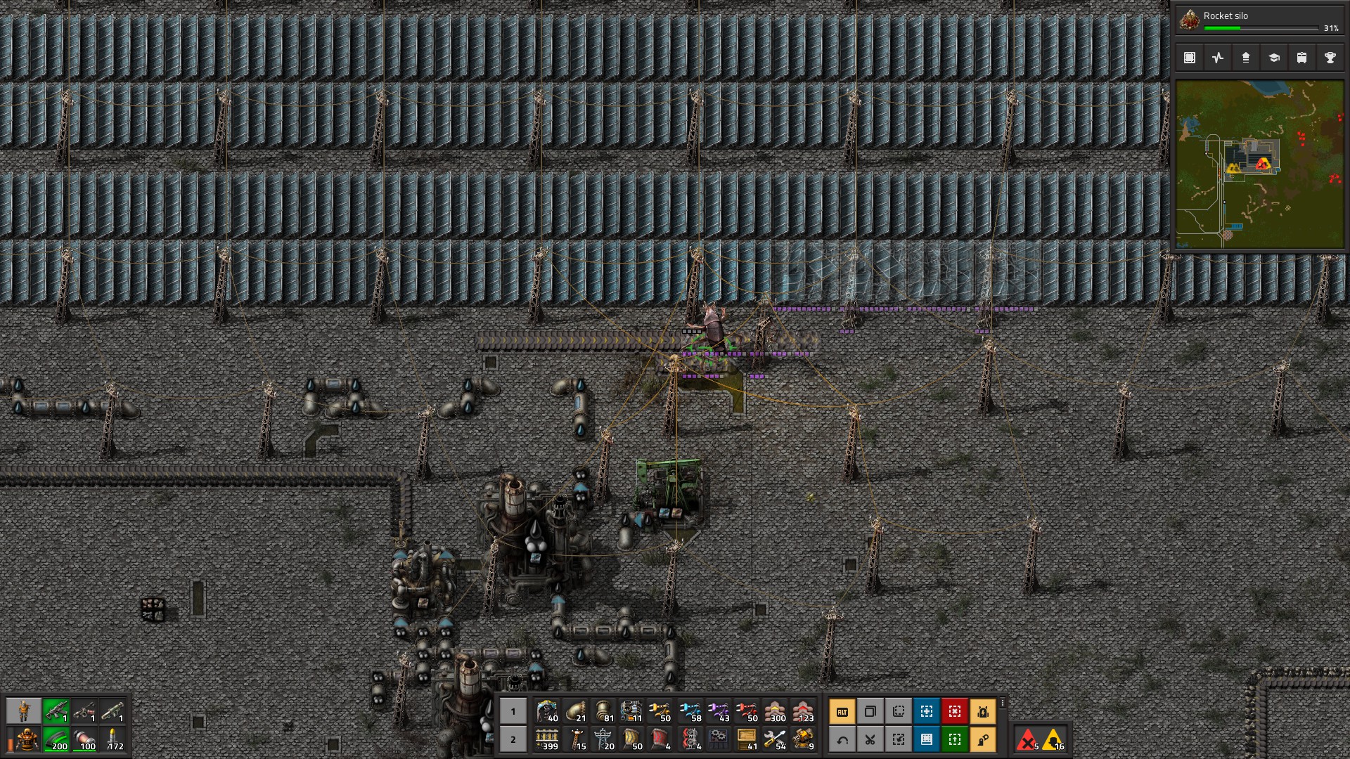 With the bugs as constant pressure and no way to live in harmony with them then the task of industrial procurement turns to warfare. You are the start of a logistics chain that takes iron ore in the one end and puts artillery shells onto alien hives at the other. In the beginning you'll sweep nests by yourself with flamethrowers, guns and tanks but by the end you'll have a blueprint that connects a self-contained artillery base to the end of your rail line that can destroy every nest within range. You can do it with lasers, with rockets, from the top of a giant spider mech, but the inevitable message of Factorio is that all of this wonderous industry is only really good for killing fucking bugs!