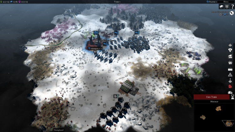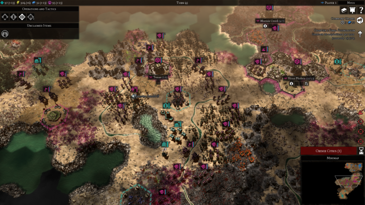 There are at least some notable mechanical differences between the factions, much more in keeping with what the Warhammer 40K games have done in the Battlefleet Gothic and the Dawn of War franchises than the very slight differences present between nations in a Civilization game. This means all the factions play substantially differently from each other in terms of how fast they expand, what unit composition they prefer, how often they get to make new troops, and so on; but nothing is ever really different because the combat resolution mechanics are always the same: you smash your unit against their unit, take away some bit of health, and repeat. Sometimes you use a special ability first; usually you don’t, because the cooldowns on those are also very long.