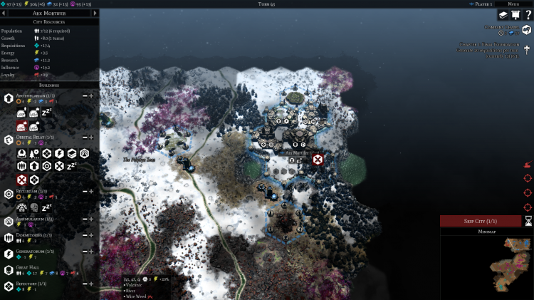 Combat. “In the grim darkness of the future there is only war,” after all, and this game is premised on the idea that people played Civilization VI for the combat. Everything is geared to it and tuned around it; you’re moving your little men around the map to engage in slow, only slightly animated, usually 3-4 turn long firefights with the enemy factions. Emphasis on “slow” -- on default game speeds, most units take 4-6 turns to come out, and unlike in the Civilization games there isn’t some production rubric that lets you speed things up; it’s just a set, specific turn limit. There doesn’t appear to be any way to buy completion; you just need to let the timer run its course.