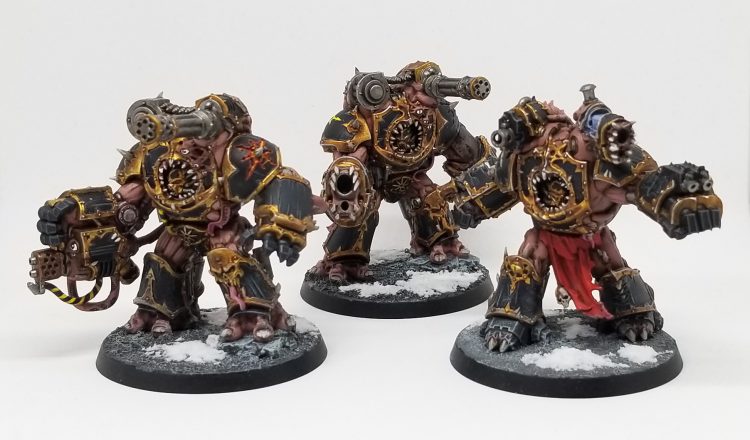 EL: Chaos Terminators x9, Legion: Black Legion Icon of Vengeance, Mark of Slaanesh, 7x Combi-plasma + Lightning claw, 1x Combi-plasma + Chainfist, Champion: Combi-plasma + Chainfist (279) EL: Beasts of Nurgle x5 (175) EL: Fiends x3 w/Blissgiver (125)