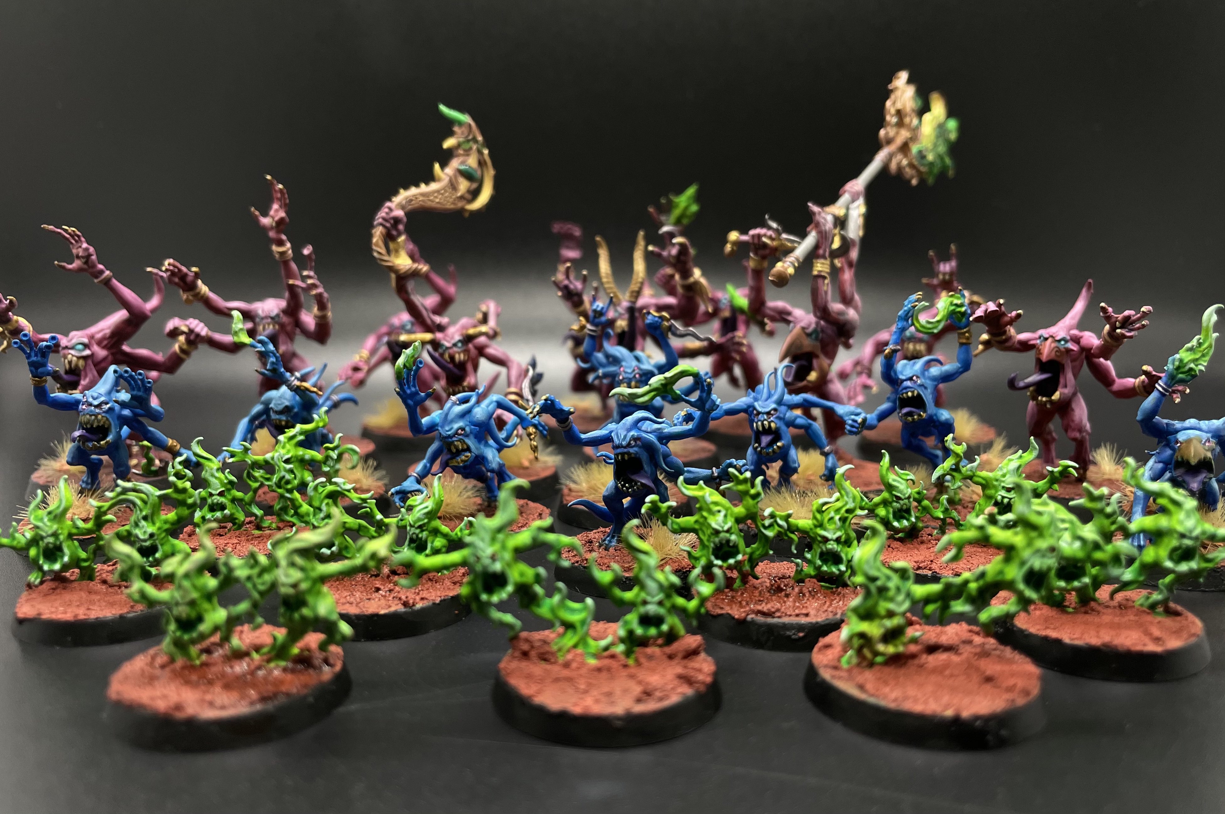 Troops: 30x pink horrors with icon 255 Troops: 3x Nurglings (66) Troops: 10x bloodletters with instrument 90