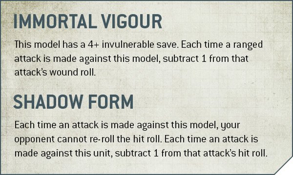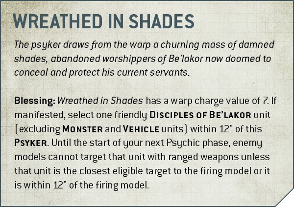 Be’lakor gets his own discipline, which is also available to psykers in the army. It is all-or-nothing so if you’re taking these powers you’re giving up one of the other disciplines. As always, there are six of these, just in case you ever wanted to roll for powers (no one has ever done this).On the whole it’s a very solid discipline but the stand-outs here are Shrouded Step and Wreathed in Shades. Shrouded Step (WC 6) lets you teleport a friendly INFANTRY unit within 18” of the psyker, picking them up and putting them down anywhere on the table more than 9” from an enemy unit. Wreathed in Shades (WC 7) lets you pick a non-monster, non-vehicle unit within 12” and until your next Psychic phase, it can’t be targeted by enemy ranged weapons unless it’s the closest unit to the firing model or within 12”.