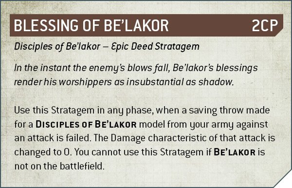 - On the “any unit” side, you’ve got Legions of Shade (1 CP), which allows any Disciples of Be’lakor unit in your army to move through enemy models when charging. This is one of the only stratagems that works on vehicles, and it may be pretty funny if you can combo it with a Helbrute or Contemptor. Blessing of Be’lakor (2 CP) can only be used if Be’lakor’s on the battlefield and allows you to change the damage characteristic of a single attack to 0 after you fail a save. It’s a pretty money way to keep the big guy on the battlefield if someone makes it through his other bullshit and worth keeping in your back pocket. It could also come in handy to ignore a melta shot that made it through the invuln of any Contemptor Dreads you brought.