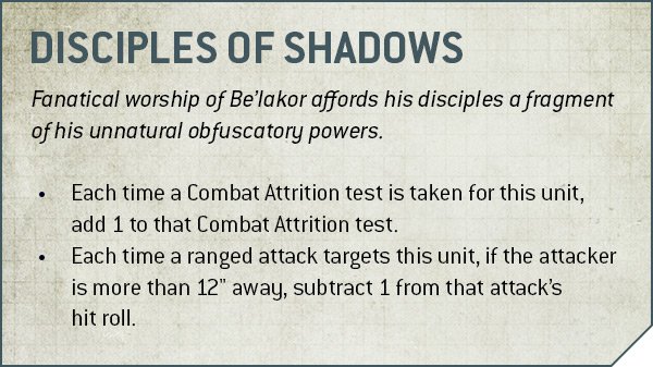 Be’lakor’s Warlord Trait that he must take is Shadow Lord, which lets him pick a friendly non-vehicle Disciples of Be’lakor unit within 9” during the Command phase to re-roll hit rolls until the next Command phase. It’s a fine ability but it is COMPLETELY worthless outside of Be’lakor’s army of renown. Fortunately, Be’lakor is not required to be your Warlord unless you’re running a Disciples of Be’lakor army.