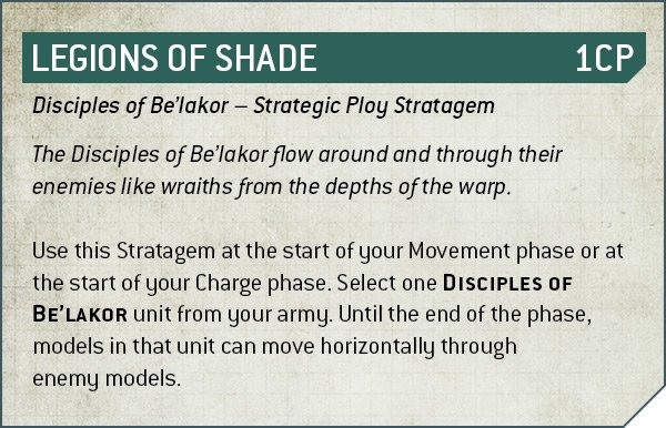 Disciples of Be’lakor get access to six stratagems of their own; two of these only affect chaos marines in the army (Legion Disciples), two only affect Daemons (Daemonic Disciples), and two affect any unit.- On the Chaos Space Marines side, Shadow Pact (1 CP) can buff an unmarked unit for a turn, giving it one of four possible benefits based on each Chaos god - pact of blood gives you +1 attack, Plague +1 Toughness, Fate a 5+ invulnerable save, and Excess +1 to move, advance, and charge. It’s an interesting boost, and gives you a lot of flexibility to do things like stand up to a volley of enemy fire, but you can’t use it to nail a charge out of deep strike because of its Command Phase timing.