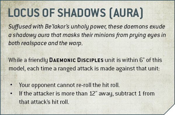 Specifically, your Chaos Marines get the Disciples of Shadows rule as their legion trait, which gives you +1 to your attrition tests and gives enemy ranged attacks -1 to hit if they’re more than 12” away from you. Your Daemonic Disciples characters (heralds) don’t get a Daemonic Locus but instead gain Locus of Shadows, an aura that gives friendly Daemonic Disciples within 6” -1 to be hit from more than 12” away and the opponent can’t re-roll the hit roll.