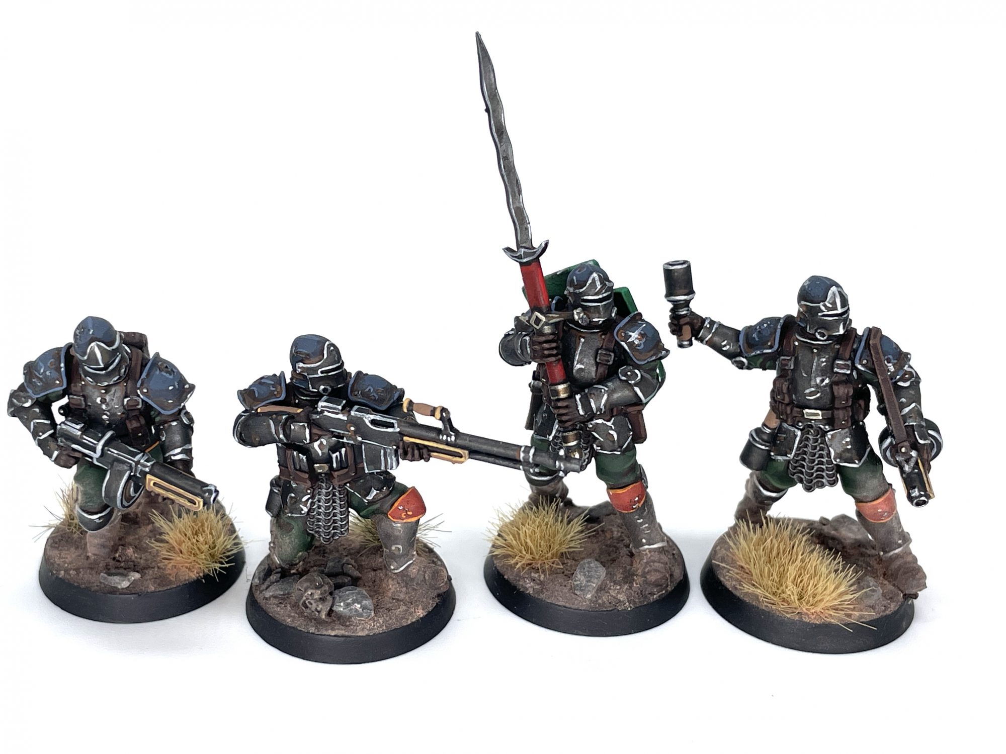 New Antioch Shock Troopers. Credit: SRMThere may have been a mistake here. The rules state Shock Troopers go on 25mm bases, but certain armor pushes them up to 32mm. I only read that first bit, and these models don't really want to fit on 25s. I doubt the people I play with will care, but it bugs me ever so slightly. I wanted a darker look with my Shock Troopers, so leaned heavily into the greys and metals I'd developed so far. To keep their scheme at least somewhat recognizable, I also painted their pants green, with some very hard to see orange piping. I figure they're more elite, so they'd likely get something a little flashier, hence the orange knee armor as well. I was steadily trying to incorporate that spot color more and more, even if I fear it gets somewhat lost in the weathering. I also stuck a spare shield on the zweihander guy's back, painting it in my typical emerald green and effectively reproducing every Dark Souls character I've ever played.