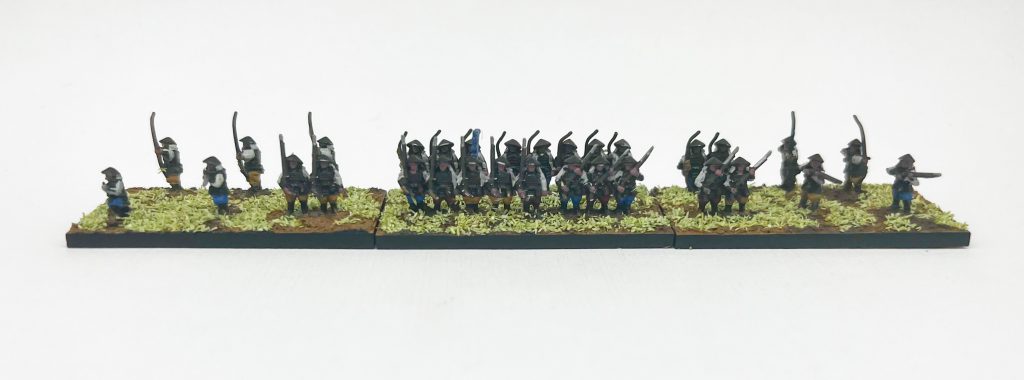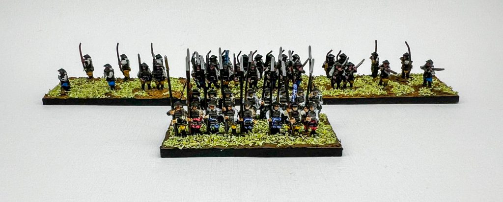 The box contains 328 models, divided between spears, polearms, bows and muskets. There are four sprues in the box, and while basing in two ranks I was able to get three bases of melee troops (combined spears and polearms) and three bases of ranged troops (combined musket and bow), giving me 24 bases in total. This is a pretty good amount of models, and even if you split them between two armies to make opposing forces you’ll be able to play very full feeling games, especially when combined with the samurai box.