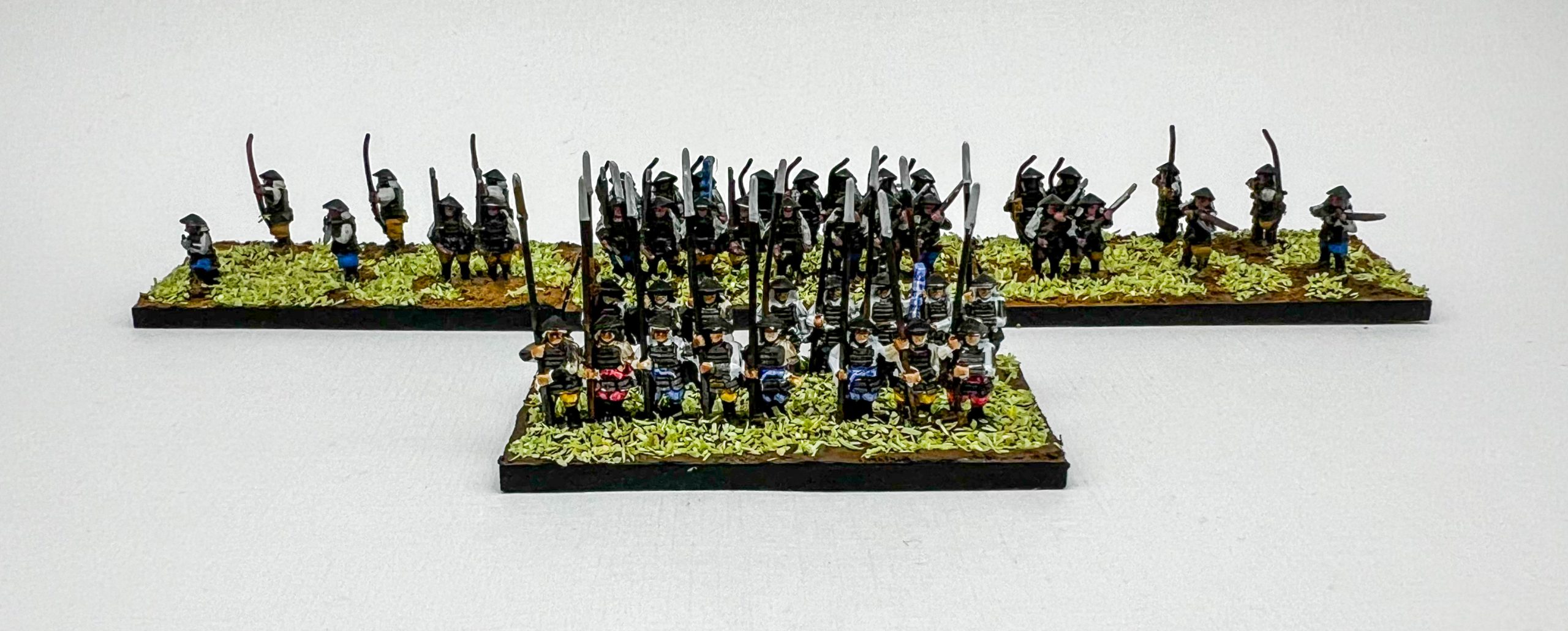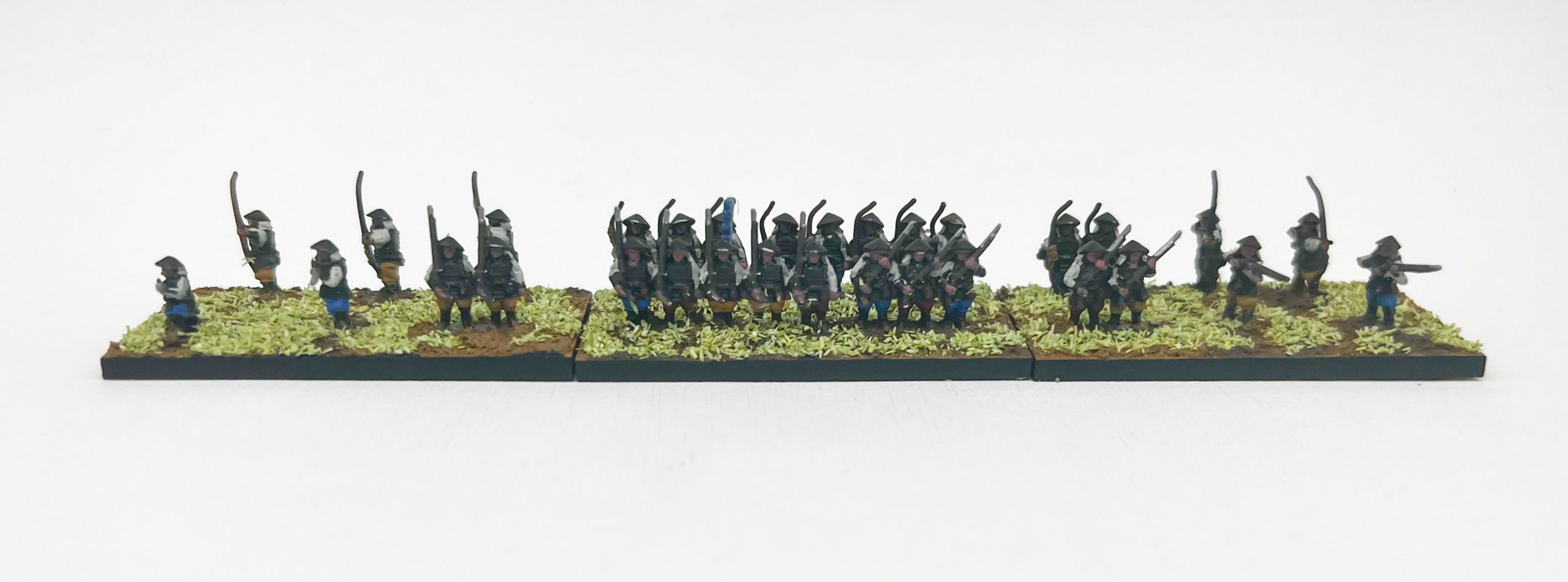 Wargames Atlantic Ashigaru. Credit: Matt JettThe troops come in different sized strips, giving you groups of 2, 3 and 5 soldiers along with individual models. This gives you lots of options, whether you want to really pack soldiers in for that massed rank feel, or spread them out to give a skirmishing look. I did a mix of both for my ranged troops, to give the impression that they’re marching but spreading out a bit on the flanks to get angles for shots.