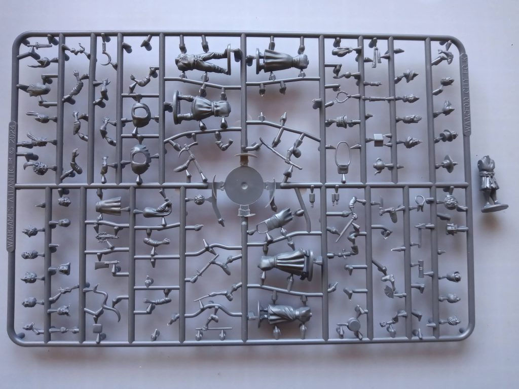 Most of the Wargames Atlantic Villagers sprue. I may have gotten so excited working on this kit that I forgot to leave any of the sprues complete for a photo. Oops. Credit: Acetronomer.Each of the 29 different heads in this kit have their own unique quirks, and likewise range in wealth and class, with a few fantasy elements mixed in as well. They're roughly evenly split along gender lines, and most have some kind of unique headwear or otherwise distinct appearance. While this makes it easy to create characterful models from just this sprue, the distinctiveness of these heads does mean you'll need to look elsewhere if you want characters who look a bit more conventional or generic. For example, there are exactly two male heads that don't have headgear, eyewear or pointed ears, and both of them are bald.