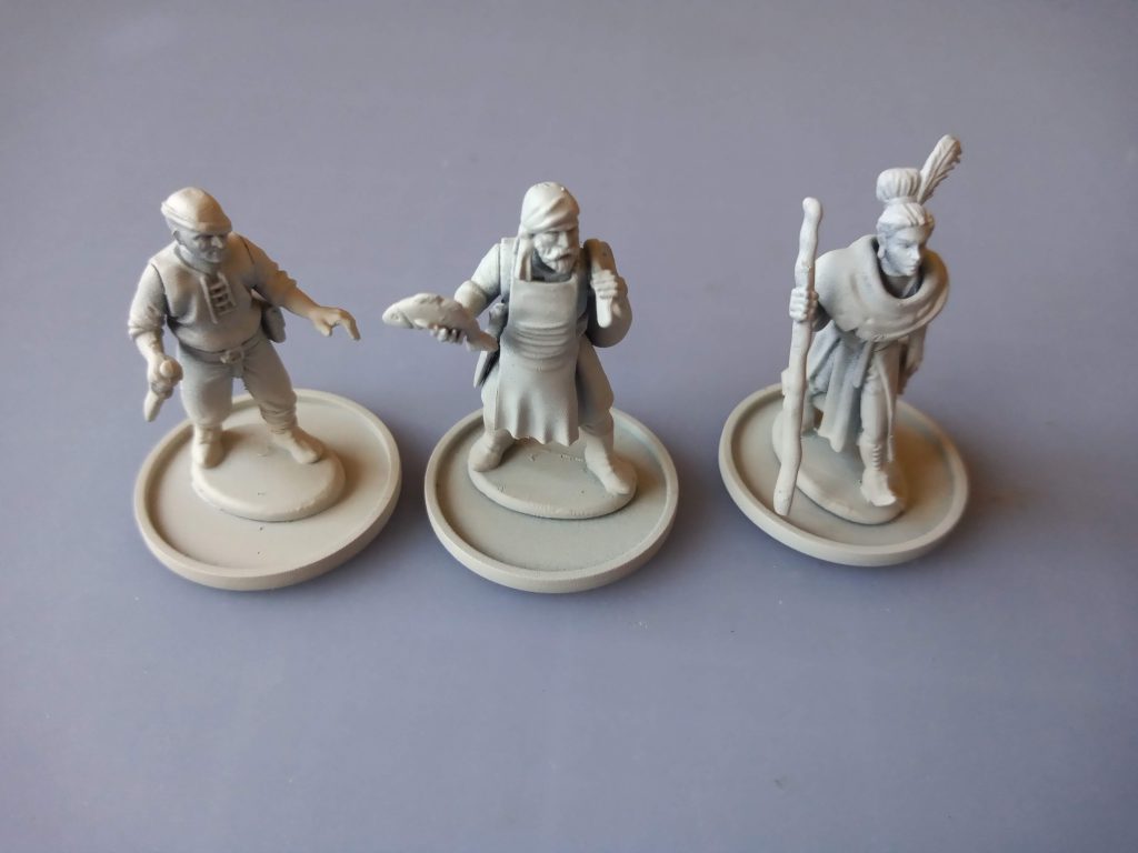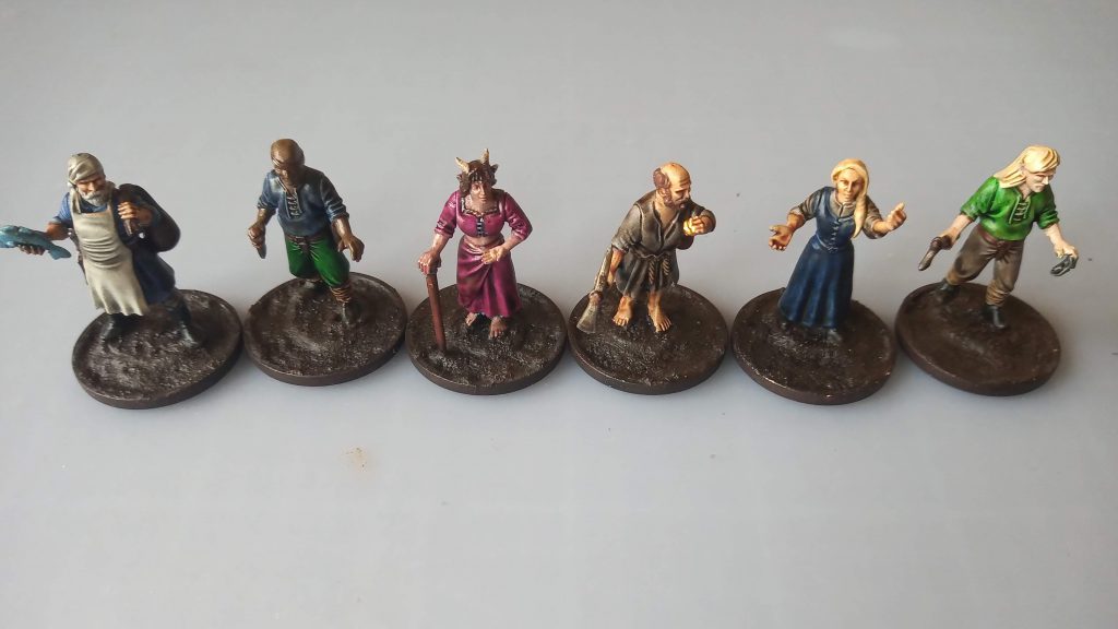 A fishmonger hawking his wares, and a down-on-his-luck miner who just struck gold. Credit: Acetronomer.I primed the models with Games Workshop Wraithbone and then used a mix of contrasts and base paints, plus a wash, depending on what paints I had on hand in the colours I wanted to use. The models took both contrasts and base paints well, and I didn't really have any issues painting them. For basing I used Wargames Atlantic's 25mm dual use bases, filled in with Stirland Mud texture paint, washed with Agrax Earthshade and dry brushed with Mournfang Brown.