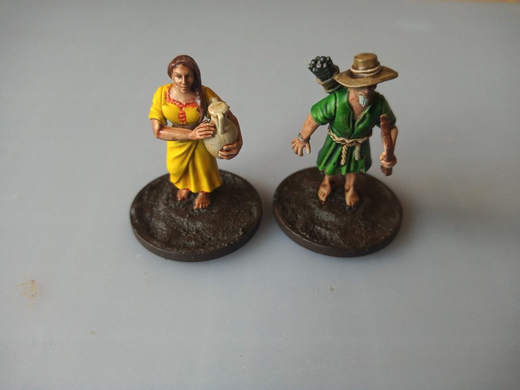 Two villagers made by kitbashing with the Wargames Atlantic Citizens of Rome kit, using the amphora and bow and quiver from that kit with the bodies and heads from the Villagers kit. Credit: AcetronomerFor fantasy and historical wargaming these models work great as part of objective markers, scenery, or dioramas, but they can also work well as special characters. A model from this kit could work very well as a priest for SAGA for example, and the handful of fantasy and magical elements on the sprue make it extremely easy to build a witch or wizard for a game like Frostgrave. If you're looking to use the miniatures in a historical context, I think it's worth noting that the clothes and options in this kit don't really correspond to a single place or period in history, so it might take a little bit of kitbashing or a carefully chosen paint scheme to make the kit work for your preferred period or setting.