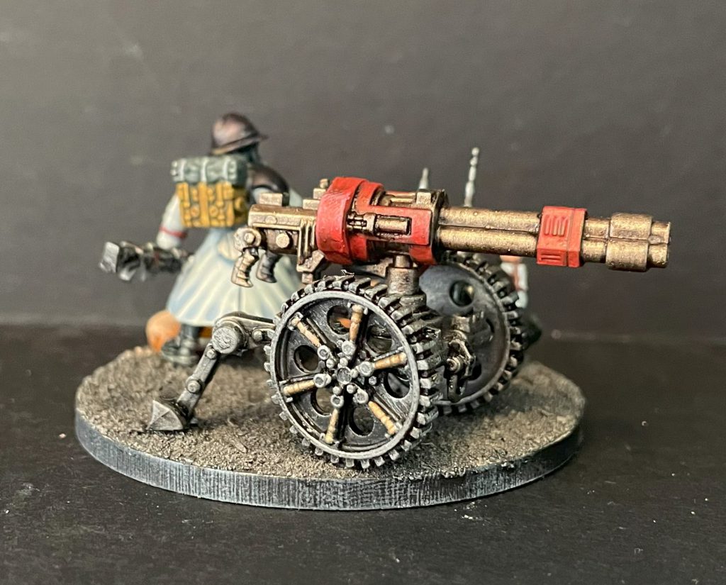 Wheeled Carriage Option, Grognard Command. Credit: LenoonAs each weapon is fixed to the carriage via a simple hole and peg you can pose weapons easily and no options are limited to either the wheeled or tripod arrangement. You could also quite easily magnetise the weapons in - particularly between autocannon and lascannon - as long as you're careful with positioning the crew trigger arms. The mortar is pretty standalone, and you could easily squeeze another three heavy weapons out of the box with a little plasticard to form a stabilising base, or even via using the gunshield on sprue. You'll need additional crew, but that's what more Grognard infantry boxes are for!