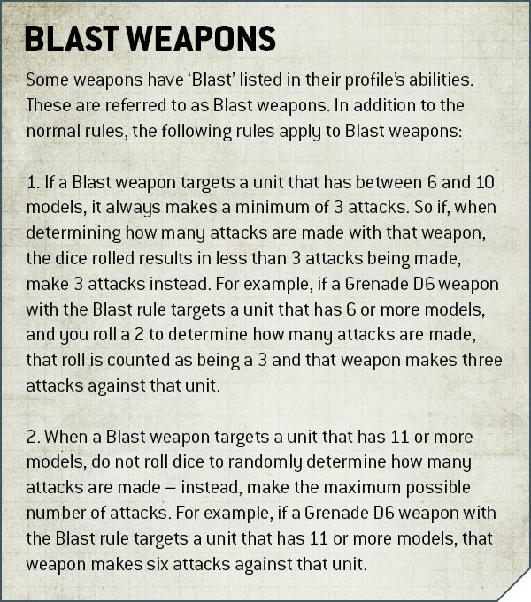 Credit: Warhammer CommunityThe big thing to note for Blast Weapons is that, against target units with 6-10 models, you do a minimum of 3 attacks when rolling for the number of attacks that weapon makes, and if it has 11+, you automatically do the maximum attacks. This makes Blast weapons significantly better against high model-count units, and helps return these horde-clearing options to prominence.