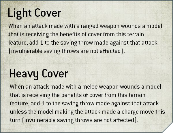 Credit: Warhammer CommunityIn the stream they mentioned that there are three types of cover: Light, Heavy, and Dense, where light and heavy are about offering protection and "Dense" is about being difficult to see through. They mentioned that cover can offer either to hit or armor save modifiers.