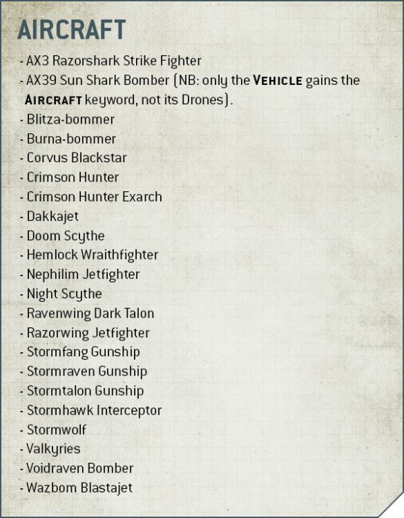 Imperial Fist Stormtalon Gunships. Credit: Jack Hunter9th edition has new and updated rules for aircraft, continuing to make use of the AIRCRAFT keyword added in the Spring 2019 FAQ, and formalising the list of units this applies to in the rulebook. The ones in the current group of codexes are outlined in the list below, and the Forge World vehicles getting the keyword will get their update in the new Indexes releasing with 9th edition.