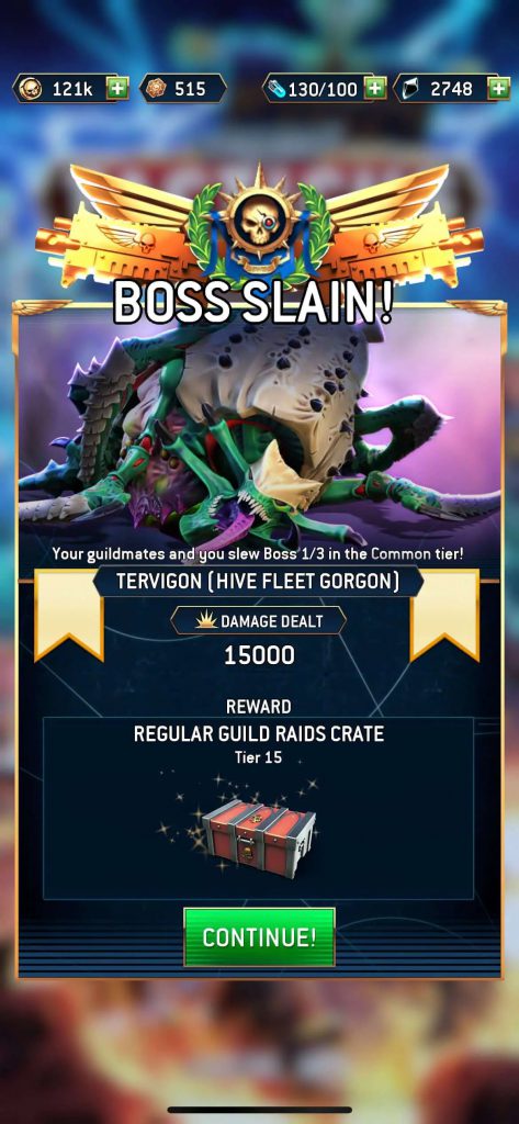 heroes never die, they just go live in your cell phone. Credit: Snowprint Studios The combat is surprisingly deep: terrain plays a major role, just as it does on the tabletop, and each character has both a once-per-battle active ability and an always-on passive ability, along with traits like Flying, Resilient, or Big Target. Levels are fast and lethal, usually finishing in a minute or two. The game has an astonishing variety of modes: the core is campaign mode, with each campaign having a fleshed-out story (complete with dialogue), but there's also Onslaught, a wave-survival mode against hordes of Tyranids; Salvage Run, a race to blow up as many crates and collect as much gold as you can in five rounds while assailed by Orks; Arena, an asynchronous PvP mode (that is, you are fighting other players' teams, but they're controlled by AI); Guild Raids, a series of bosses you can only defeat in concert with your guild; and time-limited events, like Quests (sequences of puzzle battles) or Tournament Arena (actual live PvP). The newest mode, Guild Wars, features two guilds duking it out in a series of Arena-style PvP matches, each trying to burn the other's fortress.