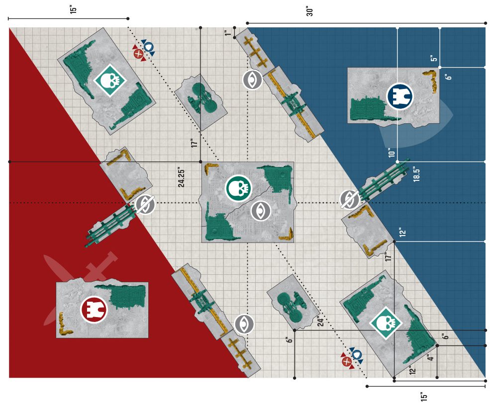 What exactly is the advantage to having this ruin sit 0.5" away from the deployment zone? Have it either be 19" away or on the deployment line; neither allows a model to sit inside it during deployment but both are easier and faster to measure. My preference is 18", as it creates a clear visual aid for players during deployment: you have to be behind this ruin.