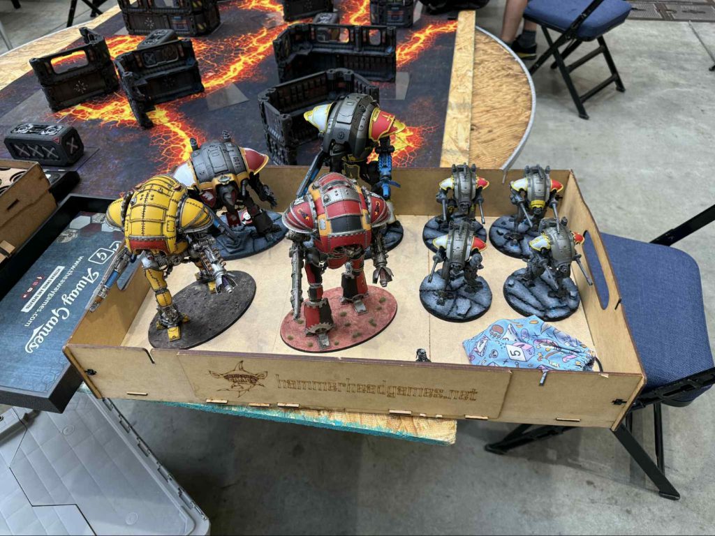 Layout 6, Search and Destroy, Take and HoldOur first round opponents were the Wrong Way Kids. I was paired into Ryan Schwarz, who also happens to work for GW and has his hands in many of the goings-on in their North American operations (if you're ever at a GW event, he's likely to be running the store, among other things). Tactically speaking, this game was pretty straightforward: Outside the two Tyrannofex there wasn’t anything that could really handle a knight chassis well and he didn’t have OC packages to push me off objectives. So I proceeded to walk right through his army and into his DZ. The lack of knight-killing threats in melee meant he needed to kill by committee, and so my ability to interrupt and punt a Haruspex was a fatal flaw in his plans. He was able to flip my home objective at one point and I failed to flip it back due to a failed Battle-shock test after I walked through a wall. I also failed to hold him to a 0 after a clutch Overwatch killed Canis Rex walking onto his home.