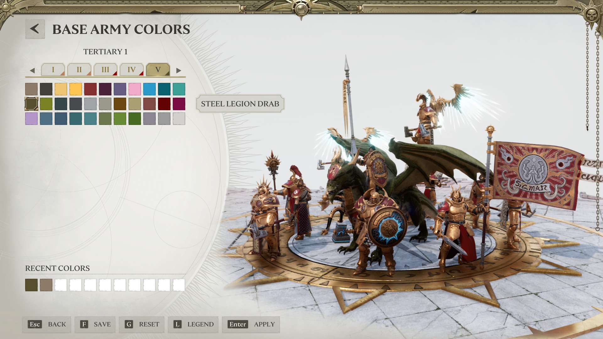 The Undying Phalanx - Now in Digital Form!Before playing a single match, I went to the livery editor and customized my Stormcast to look like my own personal Stormhost, The Undying Phalanx. The system works responsively and intuitively, but has a somewhat limited palette. You can also paint individual units, so if you wanted to do the Dark Angels thing and have your Liberators wear green, your Annihilators wear white, and your Prosecutors wear black, you could. You can also customize your multiplayer avatar, the frame around your display name, and so on. It's nothing as intrusive as Call of Duty but there are plenty of options, with more unlocking as you play.
