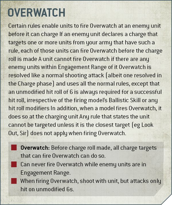 - Some units have Overwatch as part of their Datasheet or other options. This lets them fire Overwatch "for free."