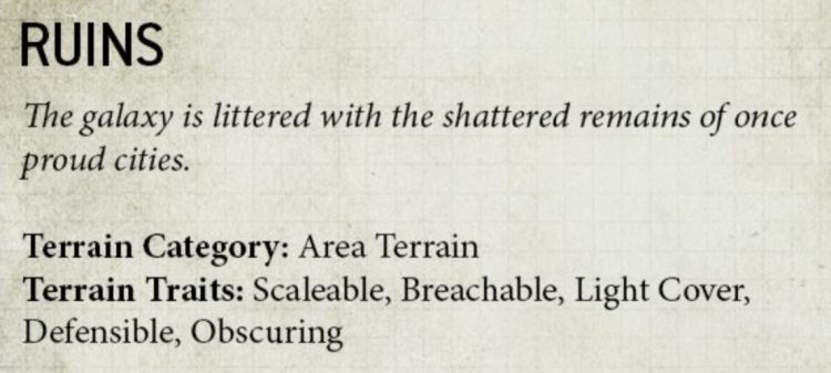 What we still don't know: We still don't know when you make this choice; if it happens when you first enter the terrain, or it's a decision that is made when a charge is declared. The latter seems more likely, but the timing will matter. It may also be an Action, so maybe you have to give up shooting or something for it.Callbacks and Interactions: We know that GW intends Ruins to be defensible terrain, thanks to the terrain article we saw last week. Also remember that this has some interesting interactions with the Heavy Cover trait. Models don't get the benefit of Heavy Cover against an opponent that charged, which puts the pressure on enemies to take the initiative. On the other hand if you're in Defensible Heavy Cover terrain and your opponent is not, you have more of a benefit to sit back and force them to come to you, or take an aggressive posture and charge them first.