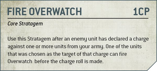 Credit: Warhammer CommunityThis has a few major consequences! The first is that Overwatch costs CP to use, making it a much more expensive action to undertake, and something you'll often just not bother with if the best-case scenario is just dealing an extra wound or two. The second is that it limits you to using Overwatch once per Charge phase, meaning that if you've got multiple chargers you can cleverly work out your actions to prevent an opponent from using the Stratagem.