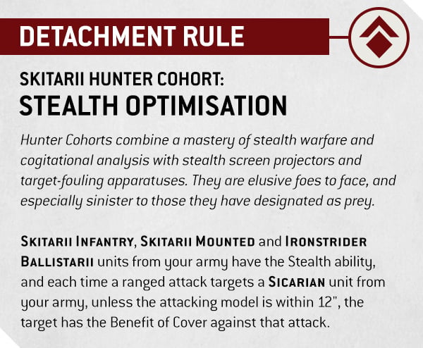 It has not escaped my notice that they previewed the Skatros alongside a new detachment rule, for a detachment that he is (at least theoretically) suited for, and the rule does literally nothing for him. He already has Stealth and Lone Operative means that he can't be shot at all from more than 12" away. He gains no benefit from the rule whatsoever. And that, my friends, is so Admech it hurts.
