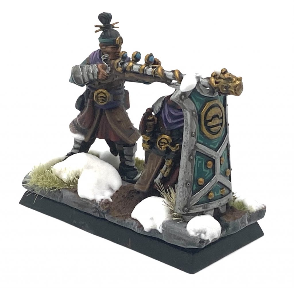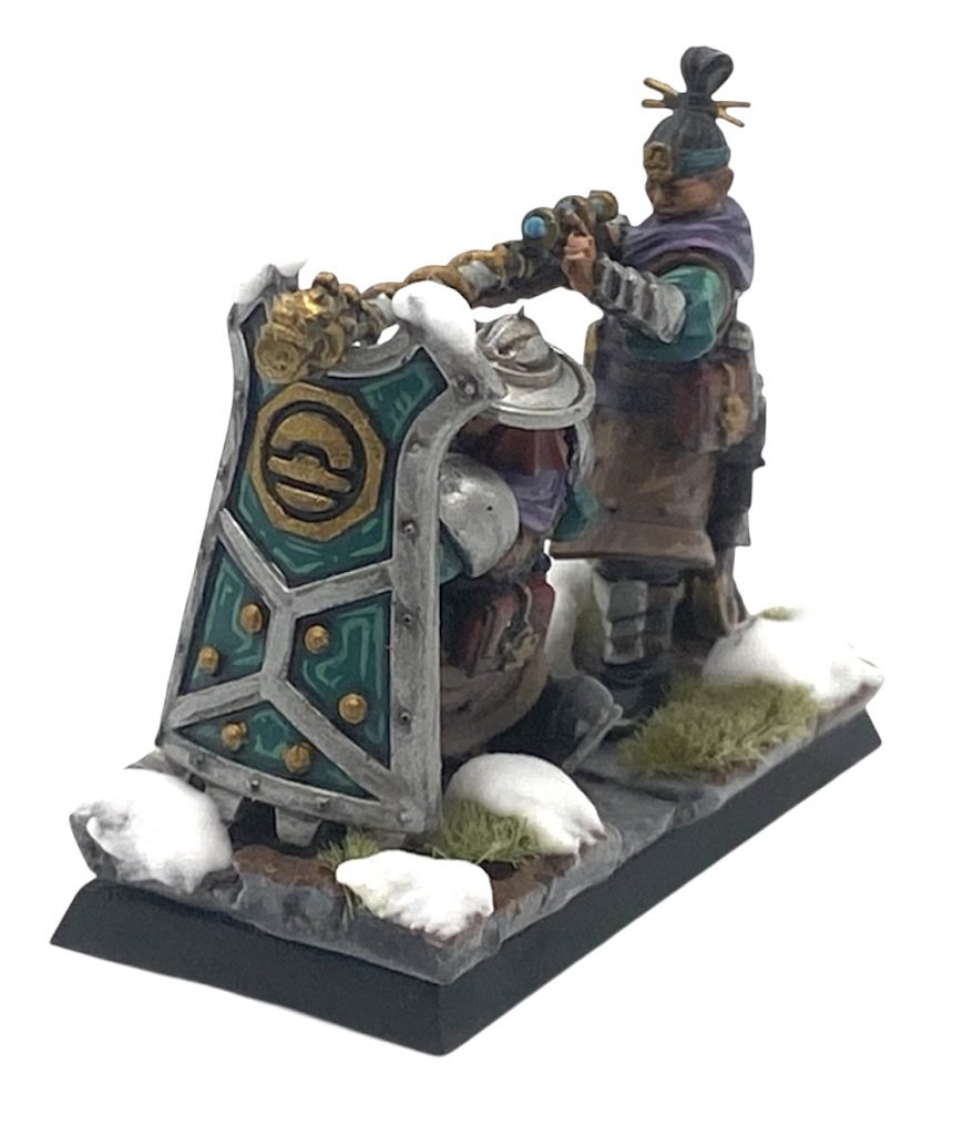 Here and with the Ironhail Gunners I’ve tried to match them as much as possible to the heavily armoured Jade Warriors/Lancers and the crew of my lanterns but outside of the shield and some under garments on their arms I’ve once again stayed away from lots of the Jade colour. It’s not a lot different but the lack of tuffs on their helmets really changes the overall colour feel of the models more than I thought it would. I’m really happy with how they’ve come out and little flashes of blue on the rifle lenses shines out more as it an entirely new colour to the scheme compared to everything else in the army.