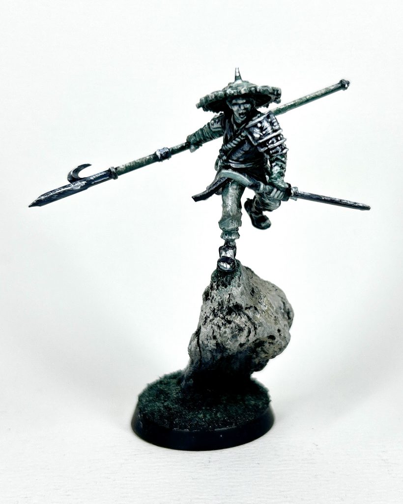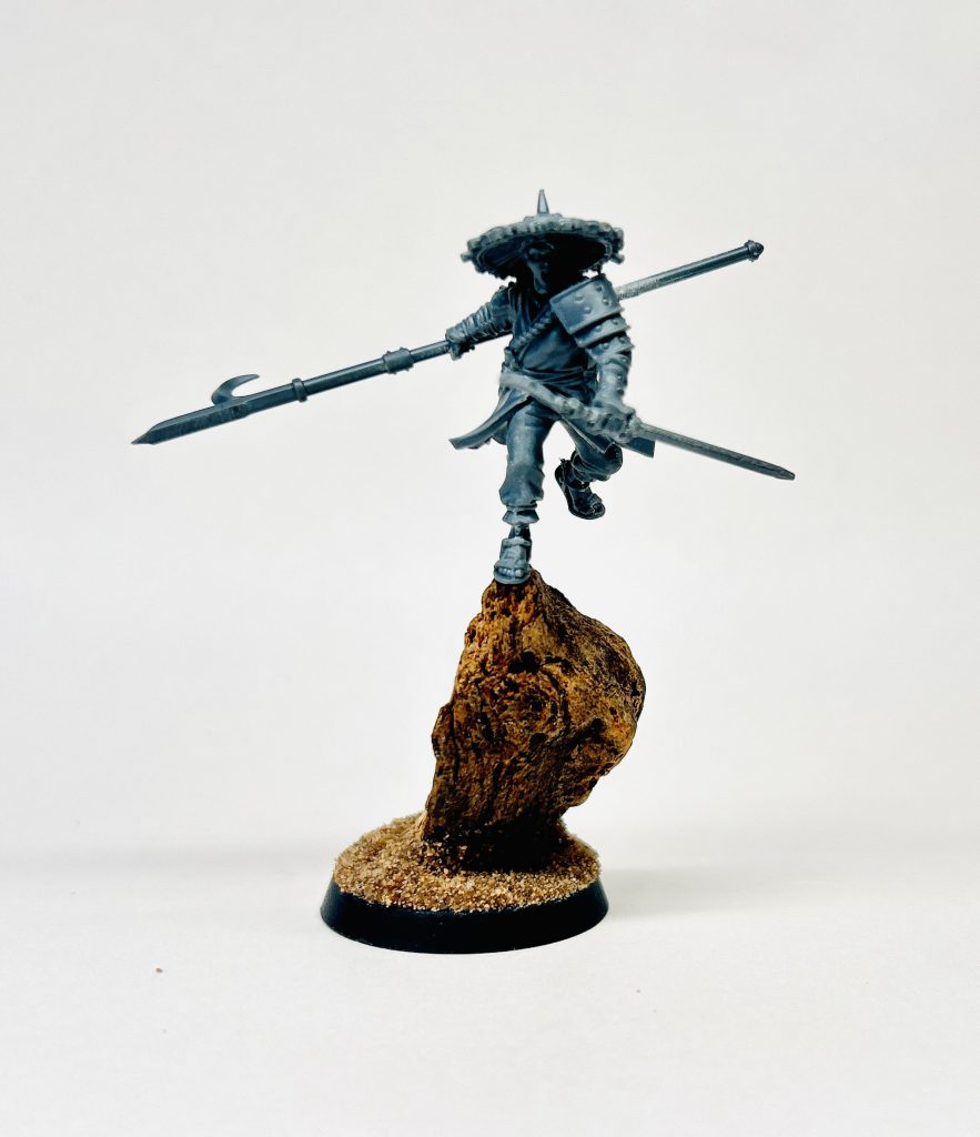 Archers in Twilight colours- @badusernametagI am actually going to have to disagree with Liam here, load outs aside if you’re looking at this kit you are blatantly here for the HATS. These hats are iconic for fast east Asian peasants and they look really cool as well as selling the whole bit. Sadly most of the standard poses for the archers (probably the more popular load out) don’t work with the hats, as either the hat fouls on the bow and/or the quiver of arrows. BOO! I want cool hats AND a bow!?? I’ve managed a couple of little kit bashes that manage both that you can see below. These kits also add to the range and give us space for some more kit bashing (you need more than one kit to make things interesting!!). Couldn’t help myself but build a wandering ronin. With spear and sword both she’s leaping from a rock. This only used parts from the various kits in the Cathay range, shaving and carving the angles and carefully switching hands between different arms to get it right. Really great kits for experimenting with what are really quite genuine and real feeling human models. Fun.