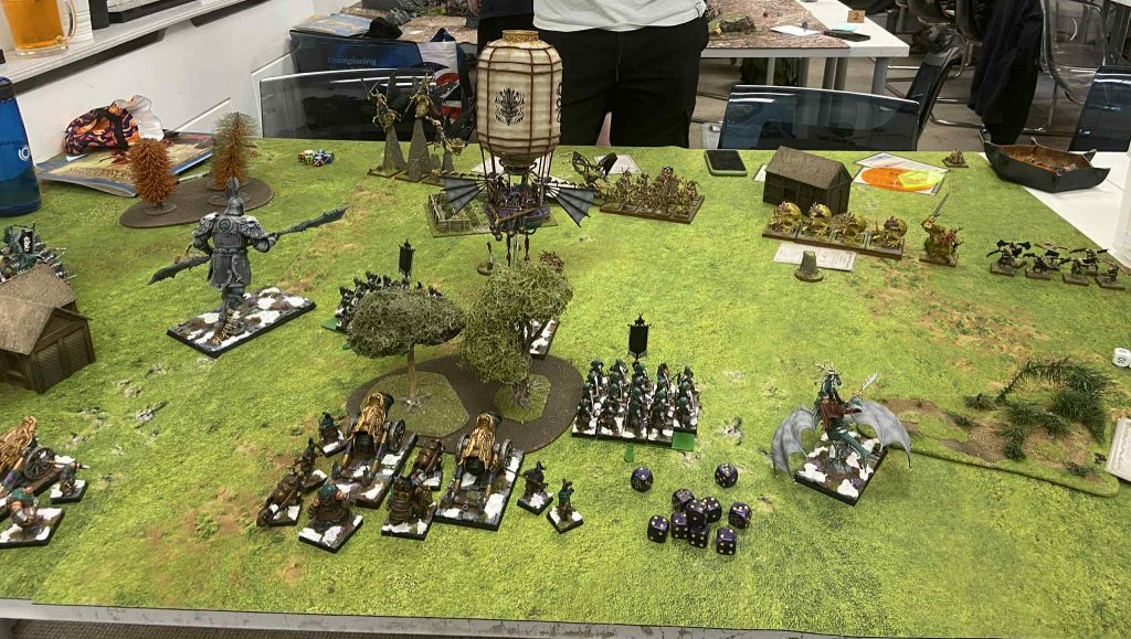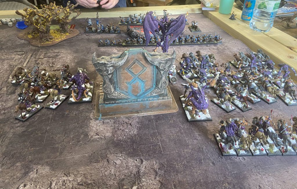 In the next example, I want to show where not taking into account all the terrain can come back to bite you. In the photo below you can see a Wolves of the Sea army advancing into a Goblin Block (pre-v1.5.1) and the Goblins have caused themselves some issues. Firstly, the Wolves of the Sea being a very numerous multiple small unit (MSU) army doesn't help the Goblins in this situation as the Greenskin player plans on using Travel Mystical Pathways to maneuver their normally unwieldly goblin unit around the table and the Wolves have gone first and pushed right into the Goblins side of the table. The Chaos Dragon has had Arcane Urgency cast on it and has moved as quickly as possible into a place where it can hide from the Doom Diver and still threaten the side of the big block. This means the goblins have to move towards the forest (Bretonnian Tents) or have it's flank on the edge of the table so any slight angle on a Give Ground of Fall Back in Good Order will force it off the board.
