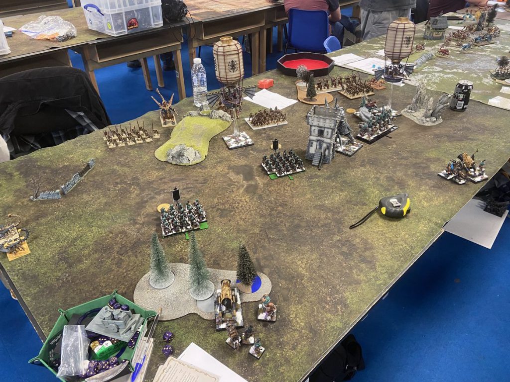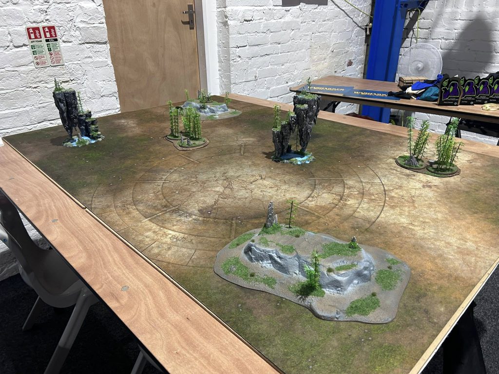 So what does a standard Old World table look like? I've borrowed some terrain pictures from a recent event I went to at Patriot Games in Sheffield (UK) hosted by the Wondering Warlocks, which are a small group of event organizers putting on regular events. The below tables are all differently themed, but all contain the "same" terrain setup, just laid out differently.