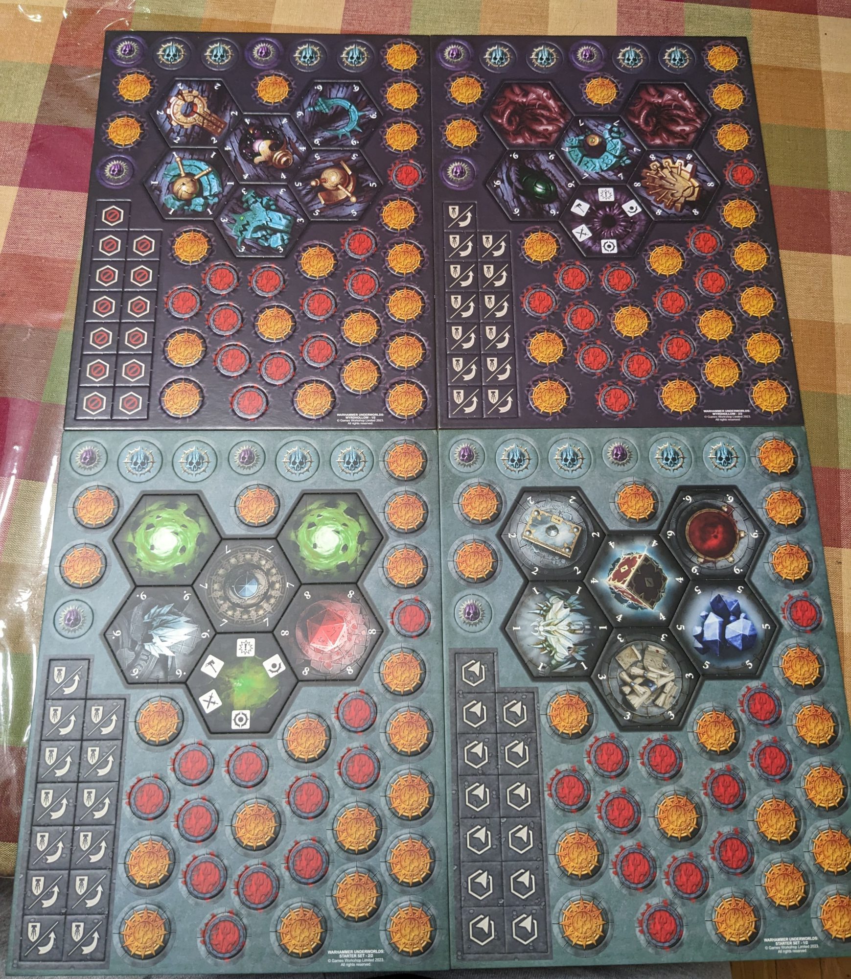 All the tokens you get with the starter set. Credit: Michael O "Mugginns"Besides the cards and minis, you also get two boards, enough dice and tokens for two players to play. I included the above picture with the tokens from Wyrdhollow on top; this new starter set includes all the same ones in a Shadespire style. That's really cool to me - this isn't just re-packaged leftover stock, this was re-designed to match the new box sets coming out with all the same stuff in mind, so if your buddy picks this up to play then they'll be right on track.