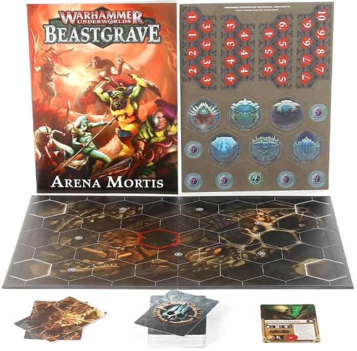 Arena Mortis was first published in White Dwarf as an alternate game mode, and now sees itself as a fully fleshed out release. The rules are similar, though have undergone some additional development. A game of Arena Mortis is played on only a single board, and each player only has a single fighter. Any miniature in the range can be chosen—from mighty Mollog to the diminutive Grot Redkap. Death is not eternal in the Arena; every round your dead fighter is returned and given a free upgrade and weak fighters begin the game with up to three upgrades on them to give them a more sporting chance.