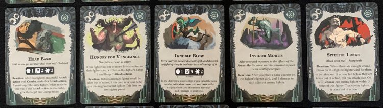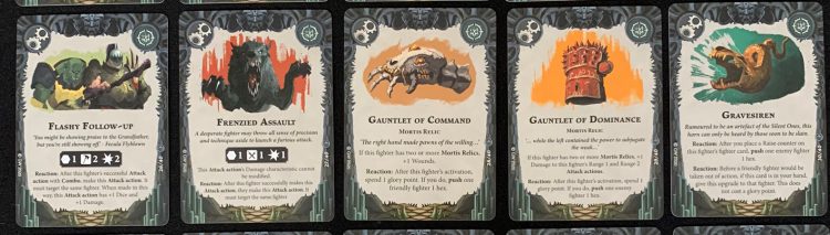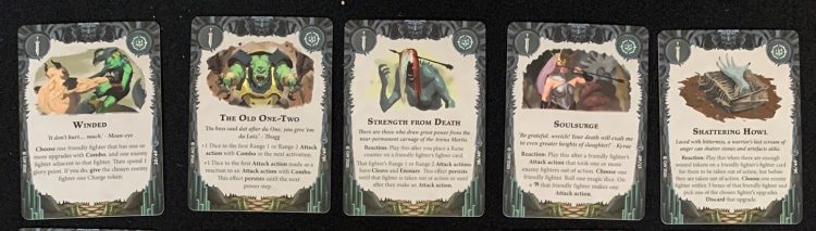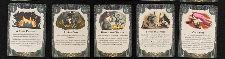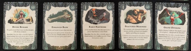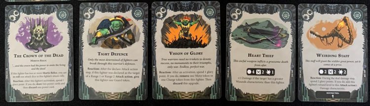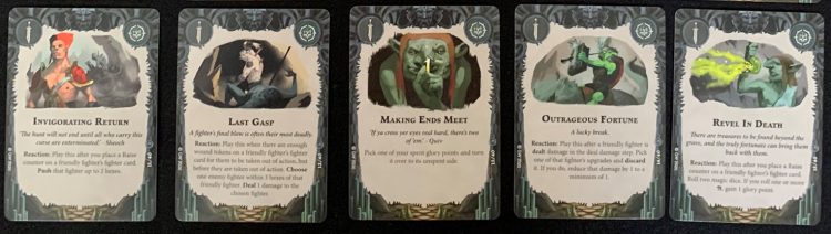 Any two of those cards are great to have, especially as doubling up on any of the passive effects is difficult, generally using a Restricted or Faction card. Any of the Reactions are good, as well. With no Glory from an Upgrade or Objective, they’re more powerful baseline than the Avatar or Lost Page cards, but you need to use that power to get extra glory.