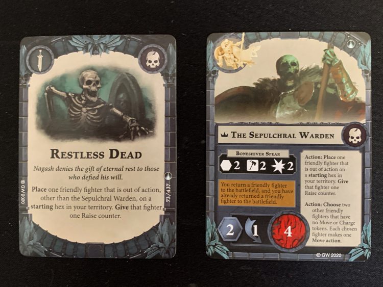Bonus Sepulchral Guard Expansion! In Arena Mortis, you put a Raise counter on your fighter any time they come back from the dead. But now, the Sepulchral Warden puts one on any fighter that he uses his Action (or Restless Dead) to Resurrect, so any Raise card outside of Arena Mortis is basically a Sepulchral Guard card.