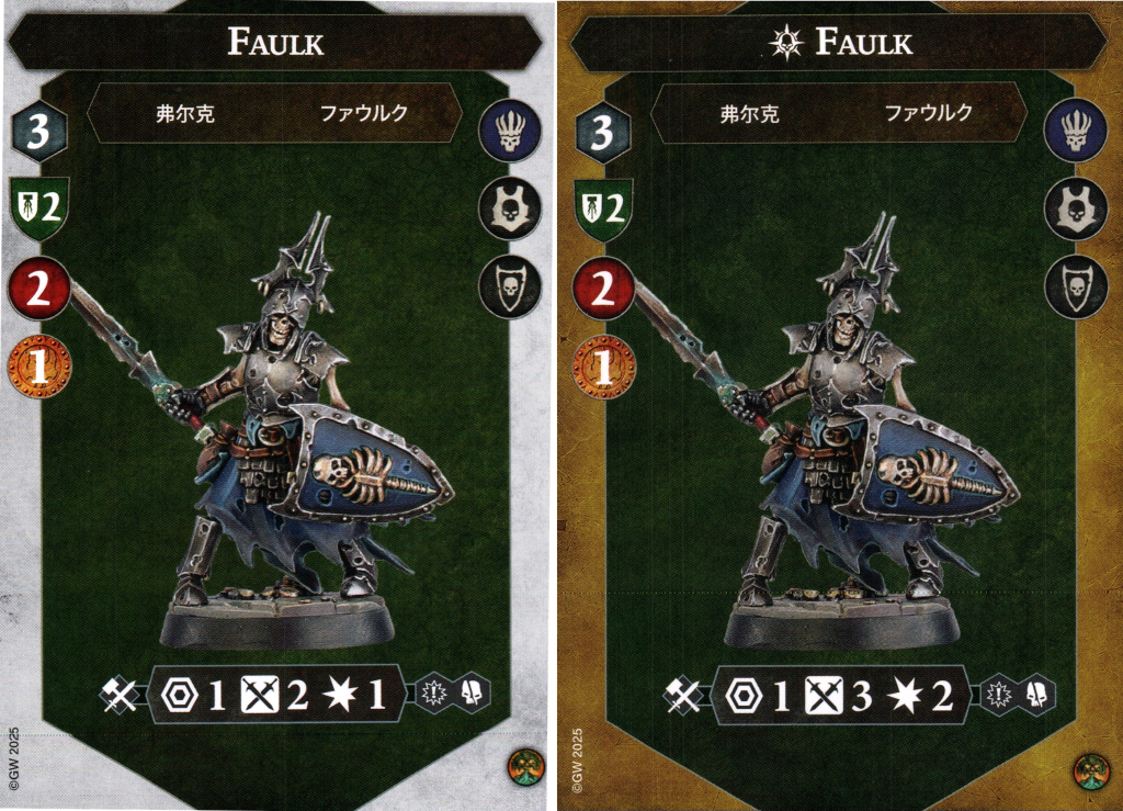 Faulk's weapon profile shows that Jedran's lack of accuracy runs in the rest of the family as well. This profile is pretty rough at range 1, 2 swords, 1 damage but since Faulk is a grave guard he can benefit from flanked from dear ol' dad. Again, critical grievous on two dice isn't something to rely on but you could always get lucky. Once inspired, Faulk is a little more accurate and picks up another base damage while retaining crit grievous so he's also a source of 3 damage, although it's unreliable.