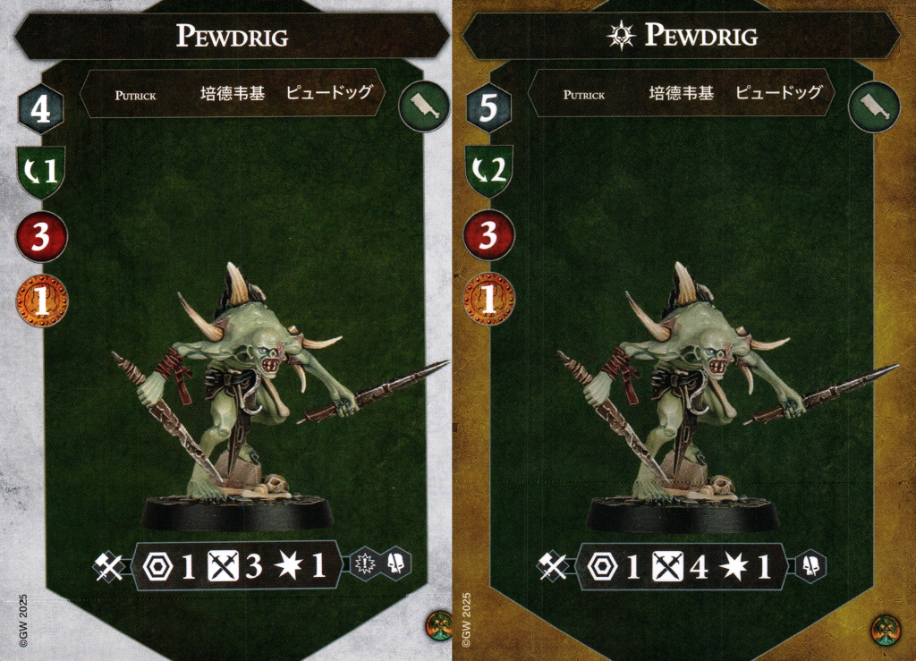 Pewdrig has a fairly similar profile to Carnskyr – he's a point of movement slower (until inspired at least) and no fly which slows him down a little bit. Two dodge is, as always, a great candidate for guard tokens.