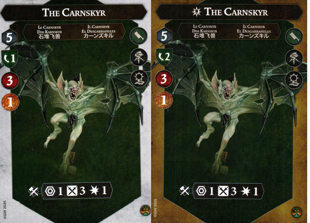 The Carnskyr is not only fast, but has fly so it's even easier for the bat thing to get around the board. He's just as squishy as Kretch is, though, so if you fly into the thick of things don't expect to live for long. At least there's an extra save dice once inspired.
