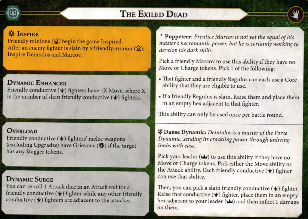 Danse Dynamic is the last but most important ability on this warscroll. We're back to caring about Deintalos and his conductive fighters. The action economy that this ability grants is insane. You spend one activation to either move or attack with four fighters. If your opponent is attacking your conductive fighters to reduce the amount of actions you get from this, that's fine – you also raise a slain conductive fighter after doing the action with all the surviving ones. Since the raise is after performing the action, if you choose to move then all of the surviving fighters will gain the movement boost from Dynamic Enhancer and then a slain fighter pops back up. The restriction here is that Deintalos can't do this if he has move or charge tokens. Normally, charge tokens are what these extra core abilities care about but the fact that Deintalos can't even have a move token is (hopefully) going to keep this from getting out of hand. The Exiled Dead player will need to have pushes or teleports to reposition Deintalos unless they're willing to forego using Danse Dynamic for the remainder of the round.