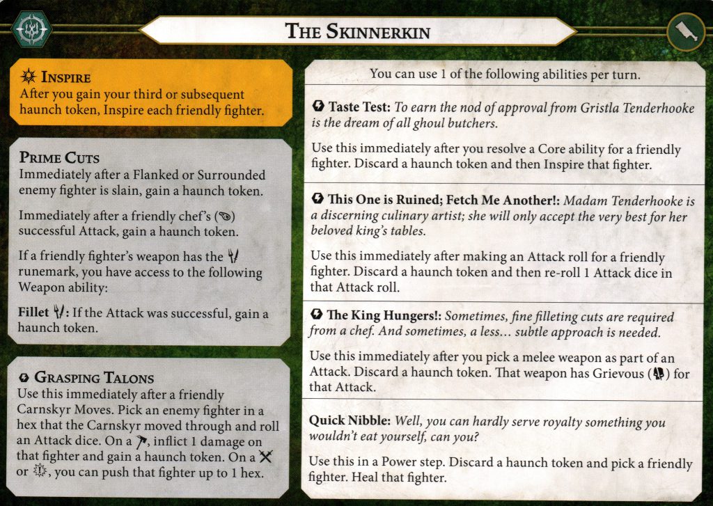Taste Test is first on the menu. Getting to discard a haunch token to immediately inspire one of your fighters has some use, but the fact that it happens after you resolve a core ability means it's a bit restricted. Inspiring does help a few of your fighters on their save dice, so if you're in a tight spot and aren't sure if you'll be able to get haunches #2 or #3, you could use this for an immediate defensive boost on Carnskyr, Pewdrig, or Seddrik. Gristla and Kretch won't benefit from it defensively, but they do generate haunches more reliably once inspired so you could use it to jump start your haunch train.